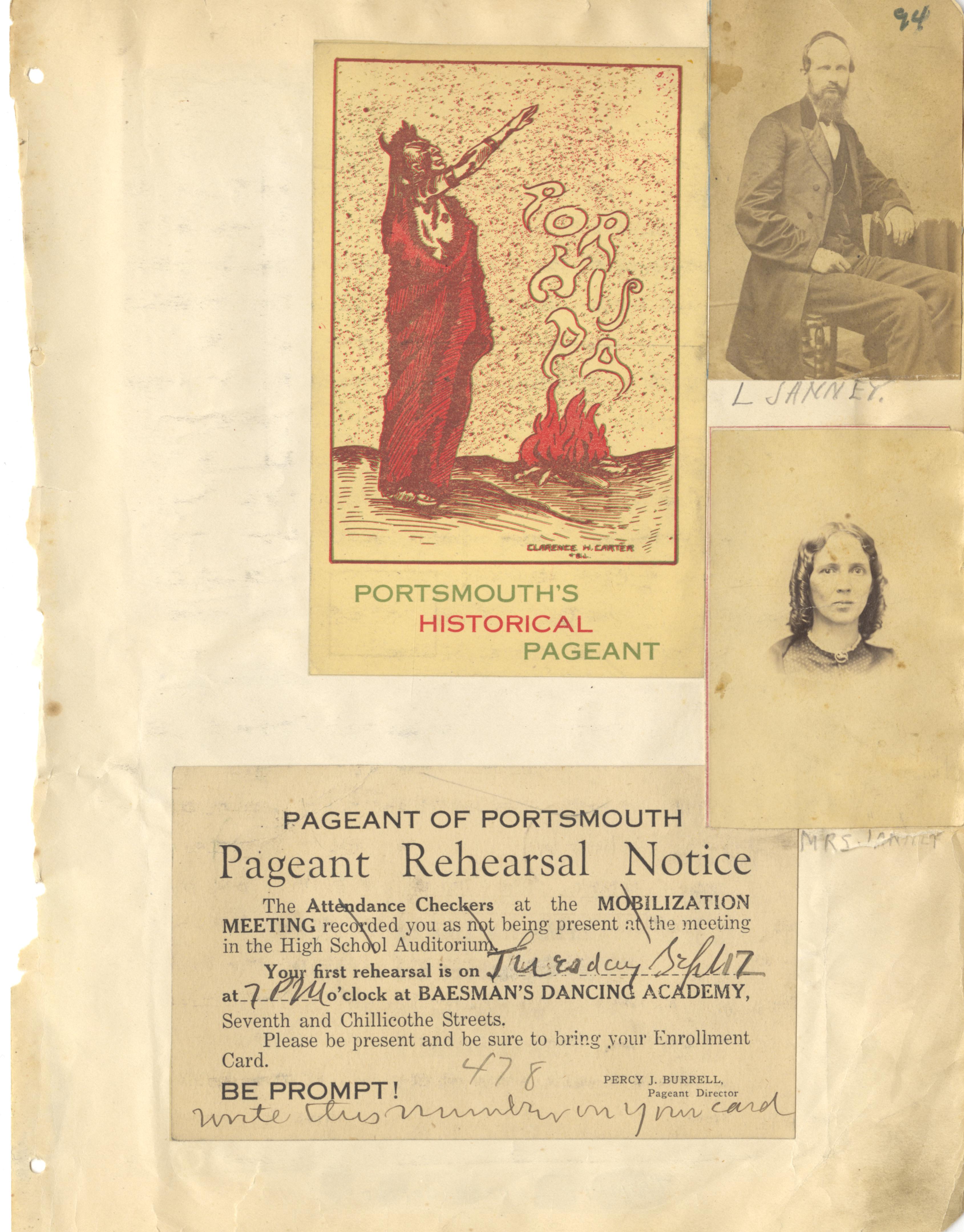 - Photo image of scanned scrapbook page: Portsmouth's Historical Pageant pamphlet and rehearsal notice to be held at Baseman's Dancing Academy at the corner of Seventh (7th) and Chillicothe Streets.
