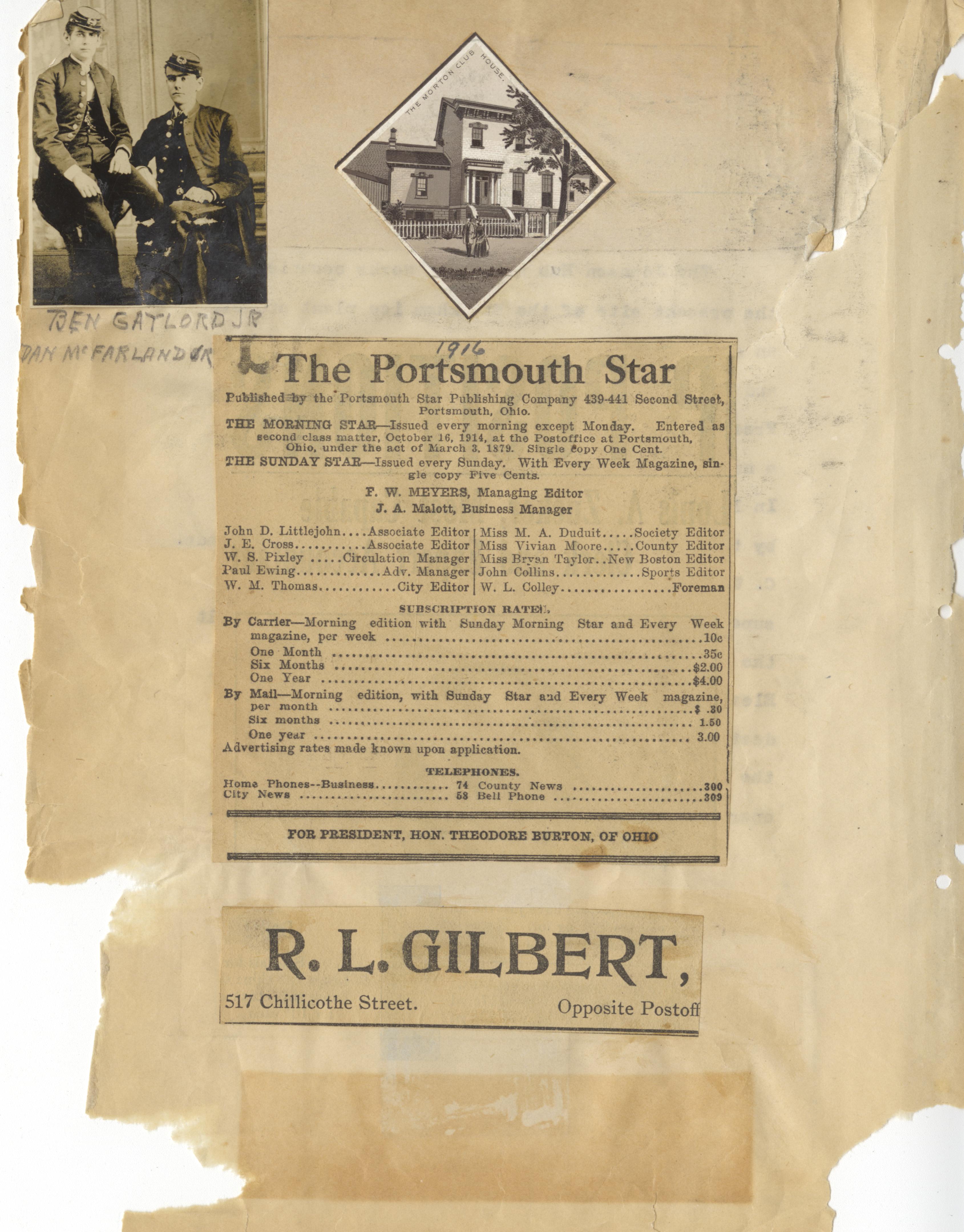 Newspaper clippings for the Portsmouth Star (1916) located on Second Street and R. L. Gilbert at 517 Chillicothe Street - Creator