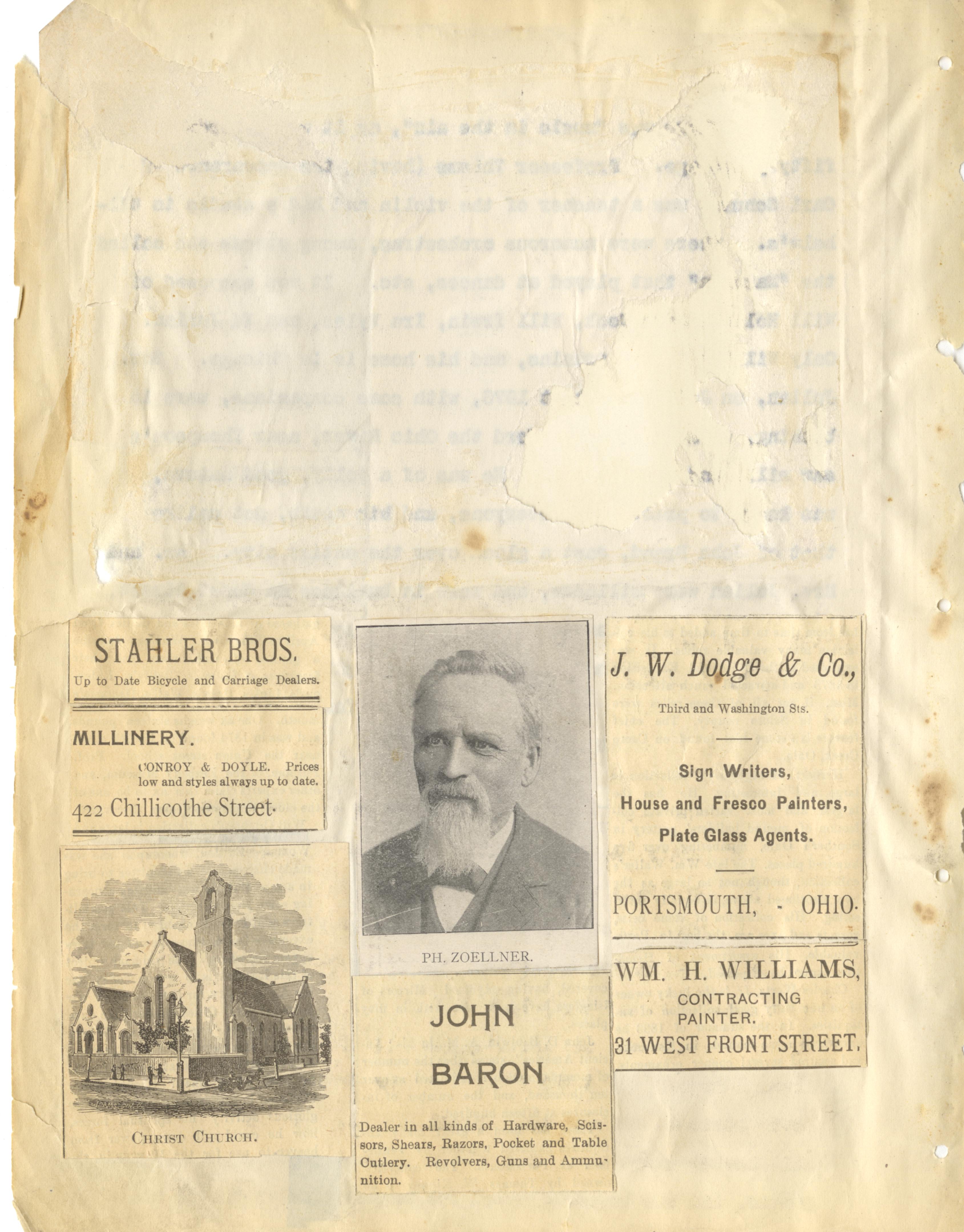 - Black and white photo image of page scanned from scrapbook. Pictured are newspaper ads for Stahler bros., the Millinery at 422 Chillicothe Street, and J. W. Dodge Co. In the center is an image of P. H. Zoellner. He owned a jewelry store on Second Street.
