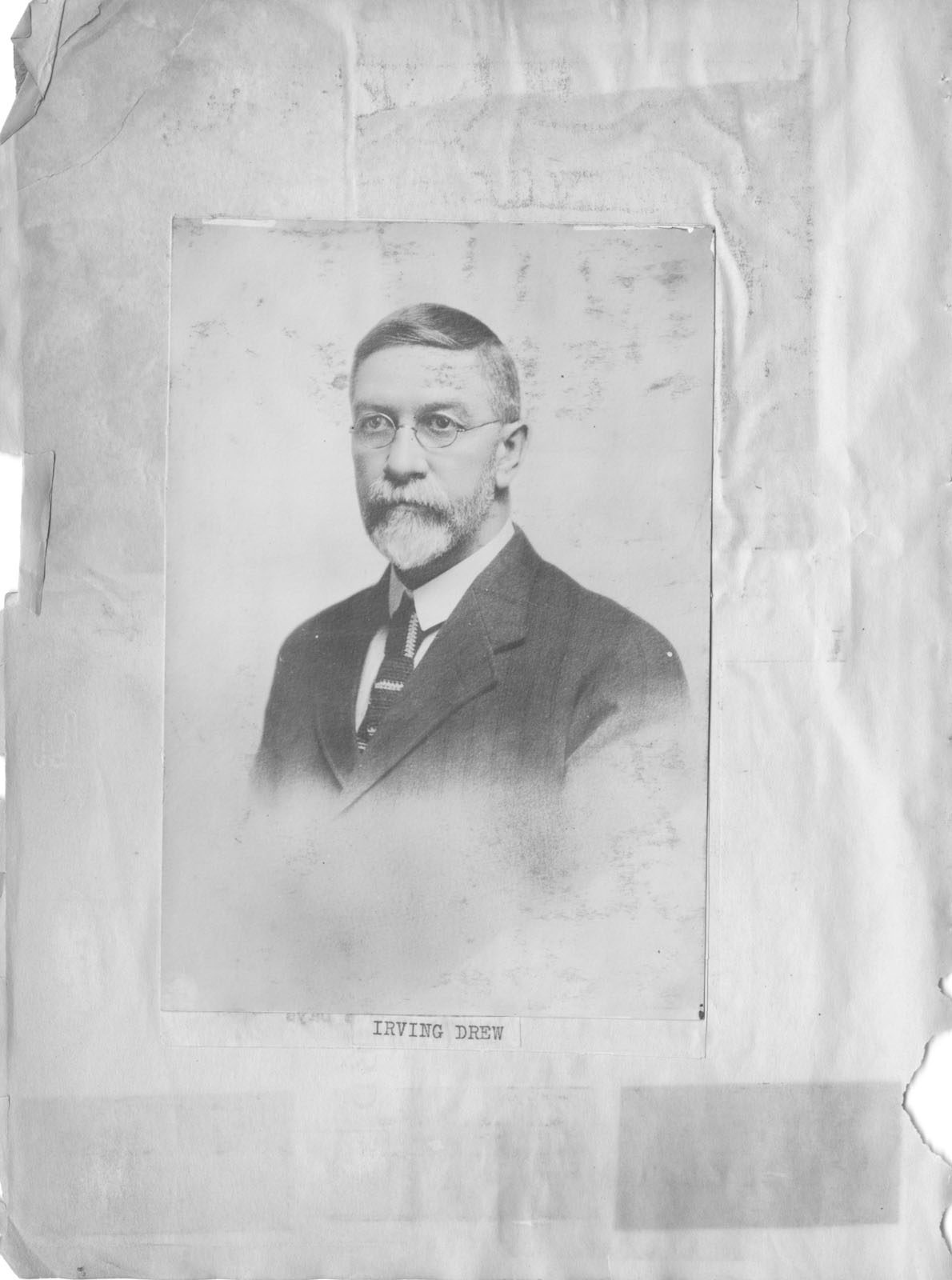 - Scanned unnumbered page from Henry A. Lorberg scrapbook containing black & white image of Irving Drew (of the Irving Drew Shoe Company).