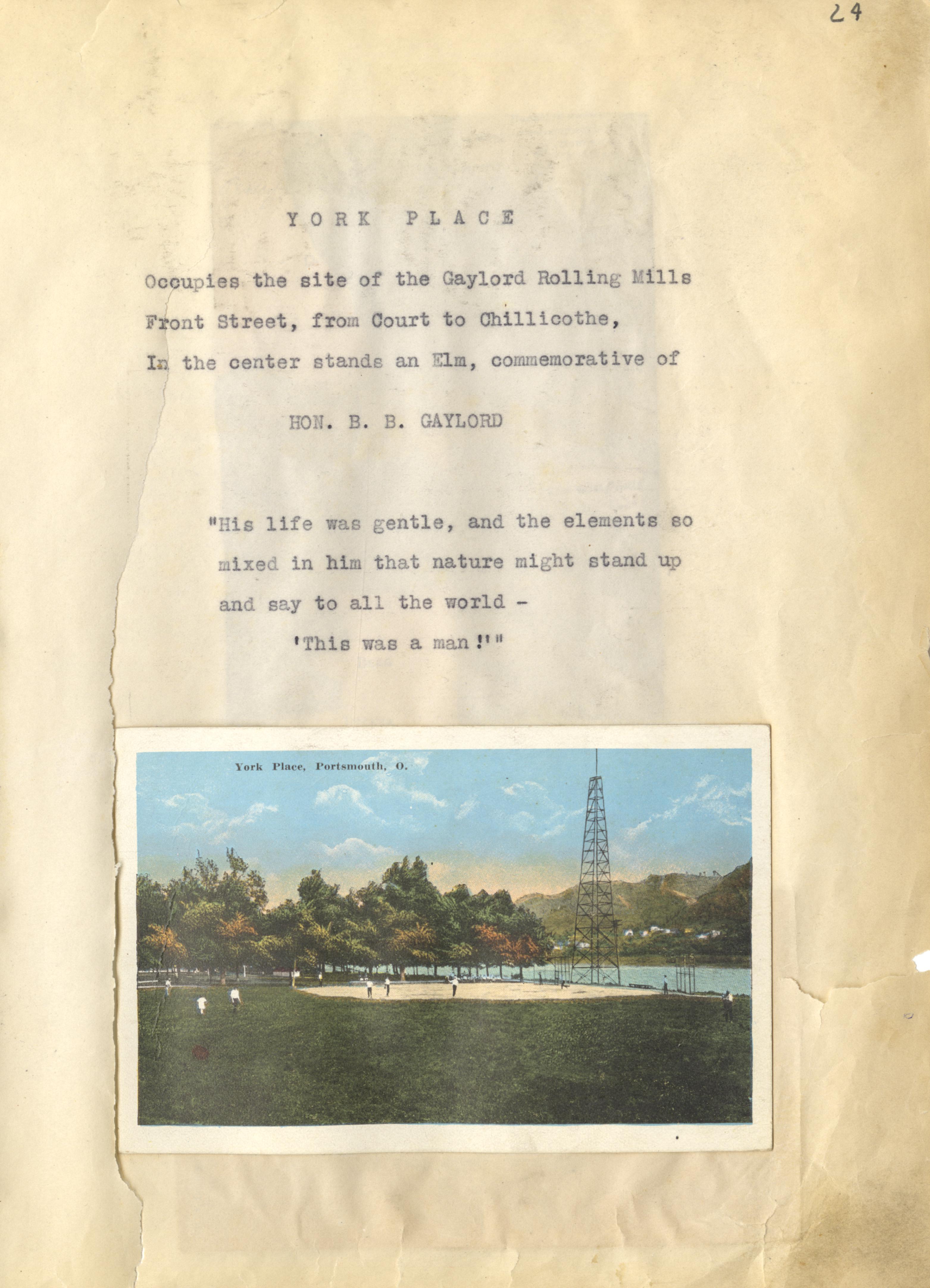 - Colorized photo image of scrapbook page. Pictured is a color postcard of York place with a few typed lines giving details about the place. York Place occupied the site of the Gaylord Rolling Mills, from Court Street to Chillicothe Street. The elm tree in the center is called the Gaylord Elm and was named in honor of B. B. Gaylord