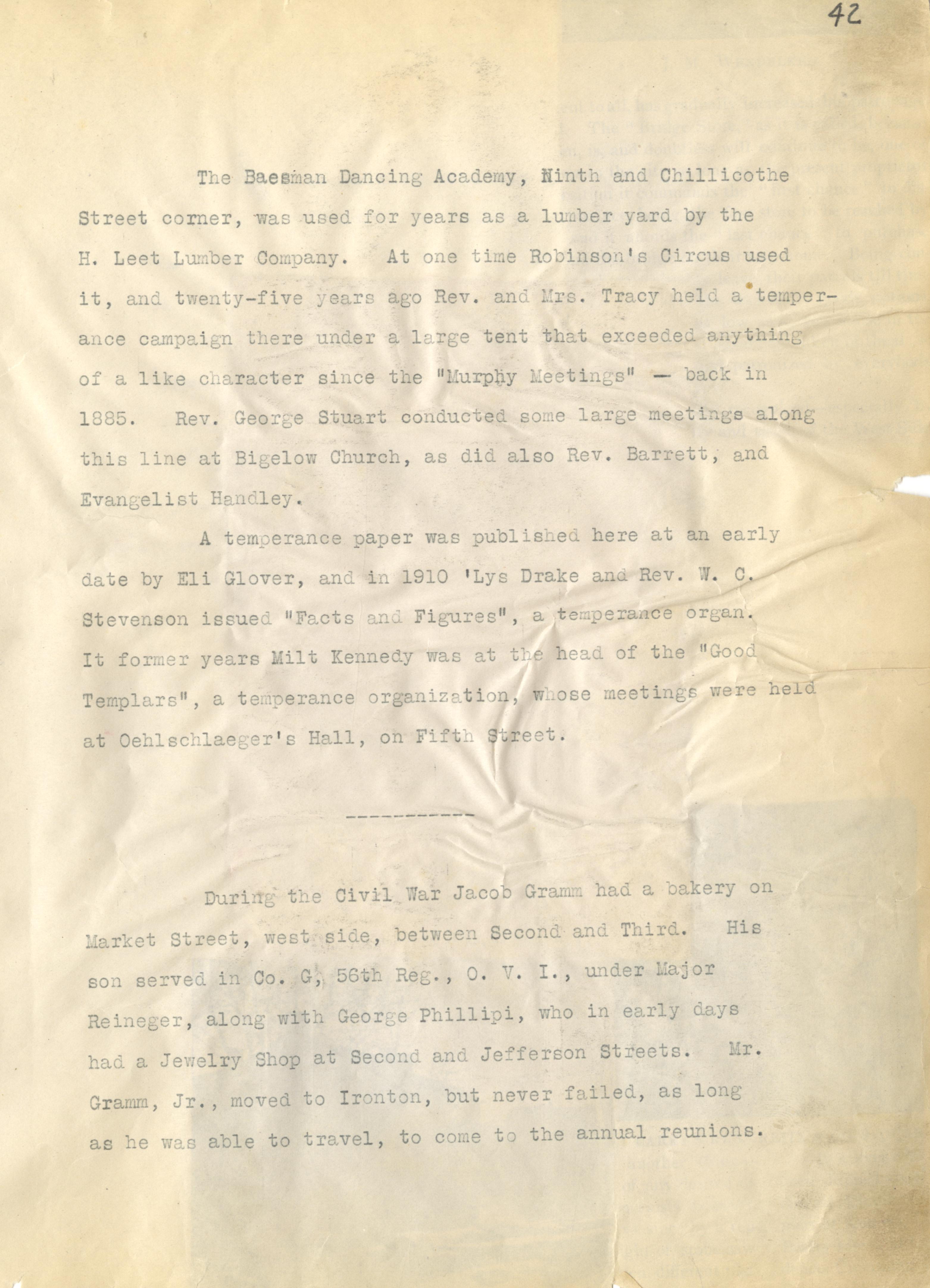 - Photo image of scanned scrapbook page. Pictured is a typed page giving the history of the Baesman Dancing Academy building and different businesses that were in it. Also, a paragraph about the bakery owned by Jacob Graham during the Civil War. Robinson's Circus; Reverend Tracy; Mrs. Tracy; Reverend George Stuart; Bigelow Church; Reverend Barrett; Evangelist Handley; Eli Glover; Lys Drake' Reverend W. C. Stevenson; Milt Kennedy; Oehlschlaeger's Hall; Civil War; Jacob Gramm; Major Reineger; George Phillipi; Mr. Gramm Jr.