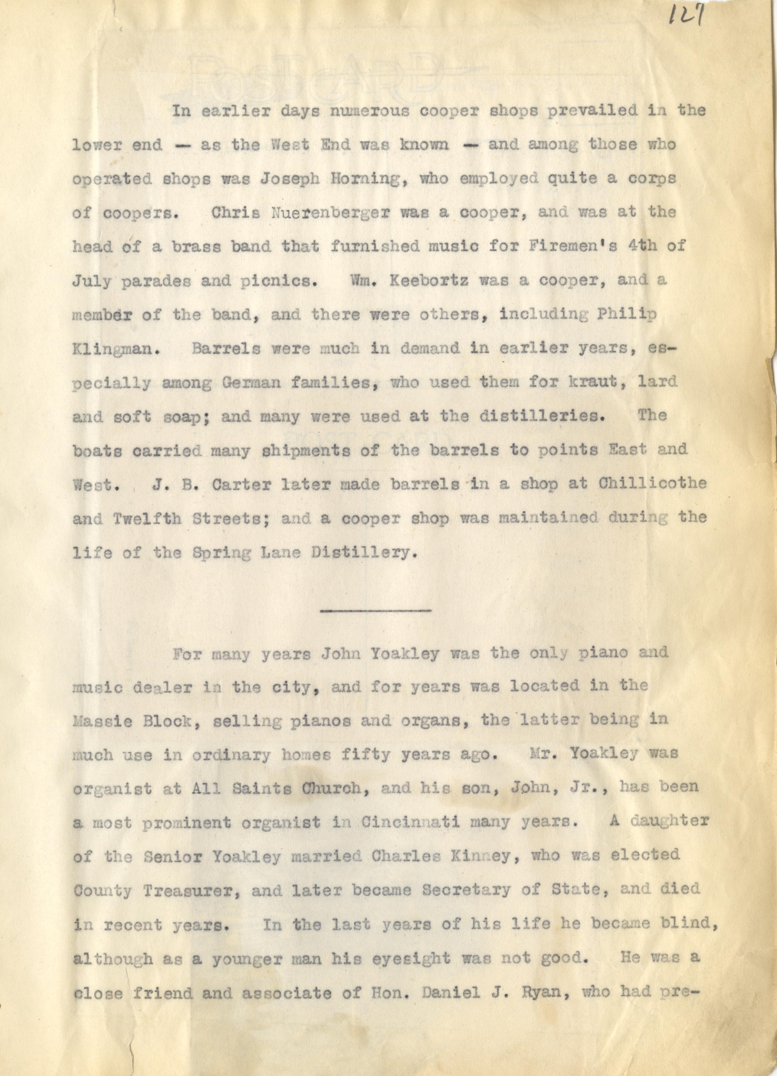 - Photo image of scanned scrapbook page. Pictured is a typed page offering details about local cooper shops and workers as well as information about John Yoakley, piano and music dealer. He was an organist for All Saints Church. Joseph Horning; Chris Nuerenberger; Firemen's Fourth of July Parade; William Keebortz; Philip Klingman; German families; J. B. Charter; Spring Lane Distillery; John Yoakley; John Yoakley Jr.; Charles Kinney; Honorable Daniel J. Ryan