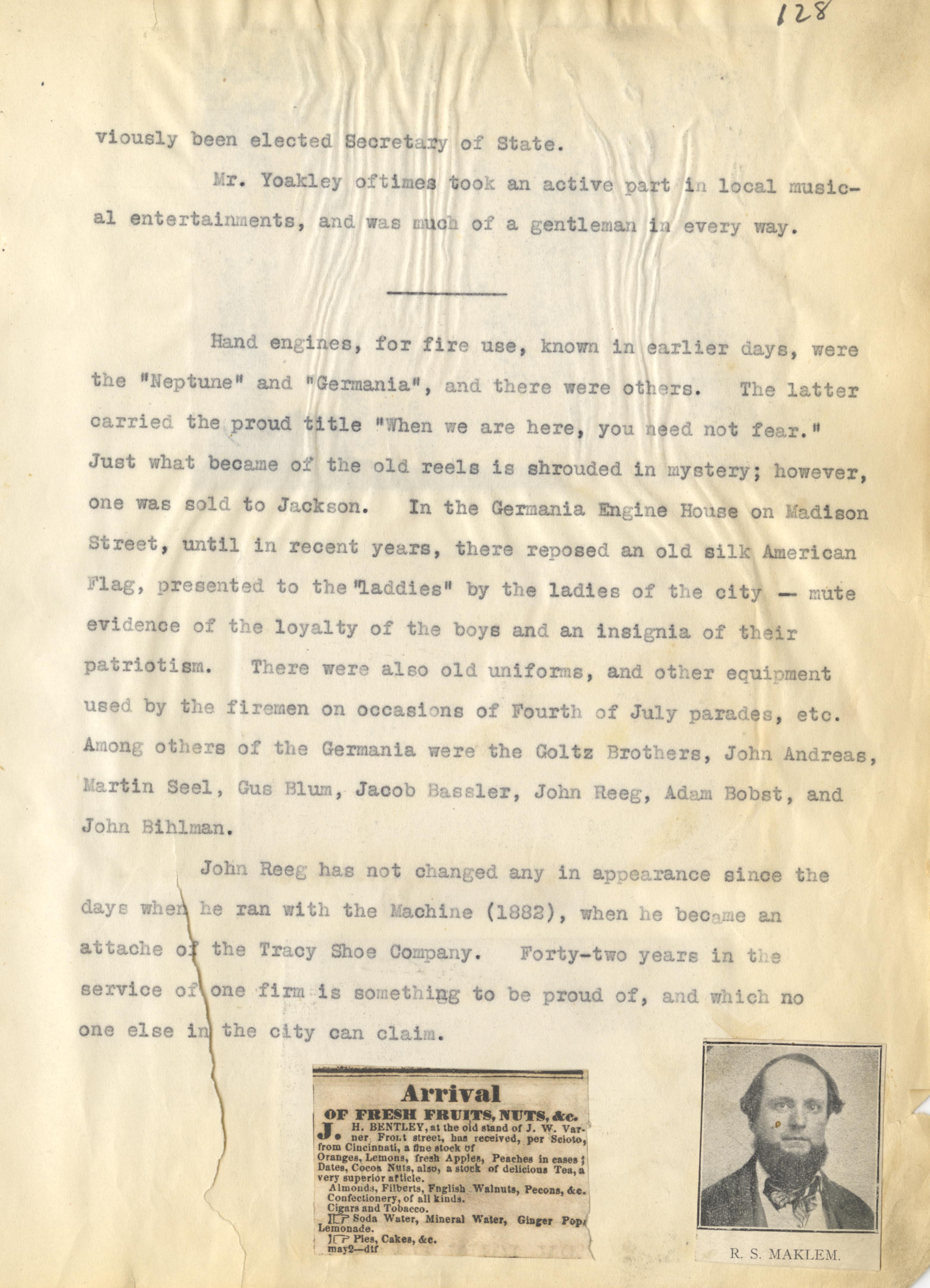 - Photo image of scanned scrapbook page 128. Pictured is a typed page giving a brief history of hand engines used at the Germania Fire Department and a photo of R. S. Maklem- cut from Pictorial Portsmouth book. Goltz Brothers; John Andreas; Martin Seel; Gus Blum; Jacob Bassler; John Reeg; Adam Bobst; John Bihlman; Tracy Shoe Company.