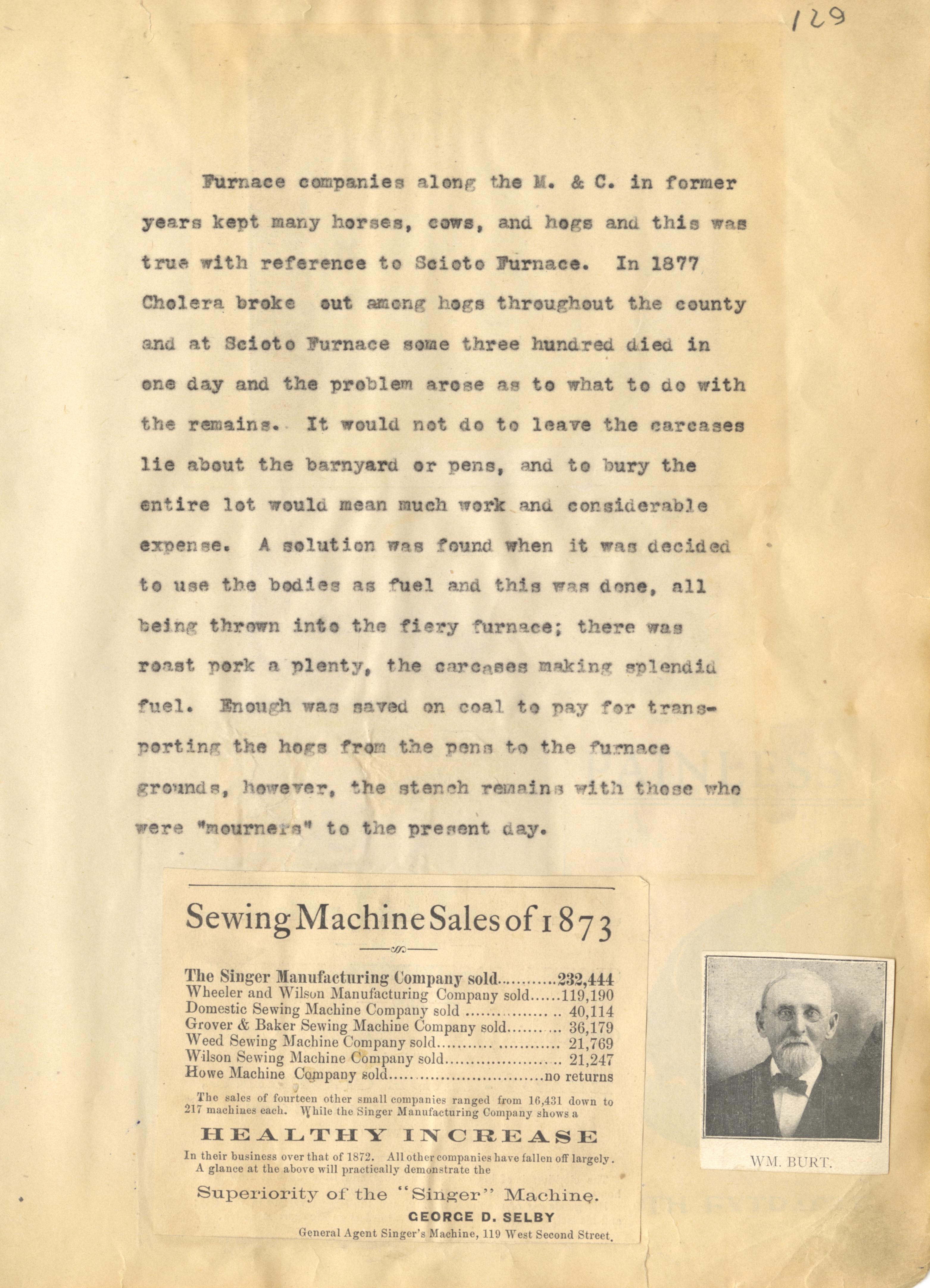 - Photo image of scanned scrapbook page. Pictured is a typed page about when bodies were thrown in Scioto Furnace after a Cholera outbreak in 1877; Sewing Machine Sales of 1873; W. M. Burt, cut from Pictorial Portsmouth.