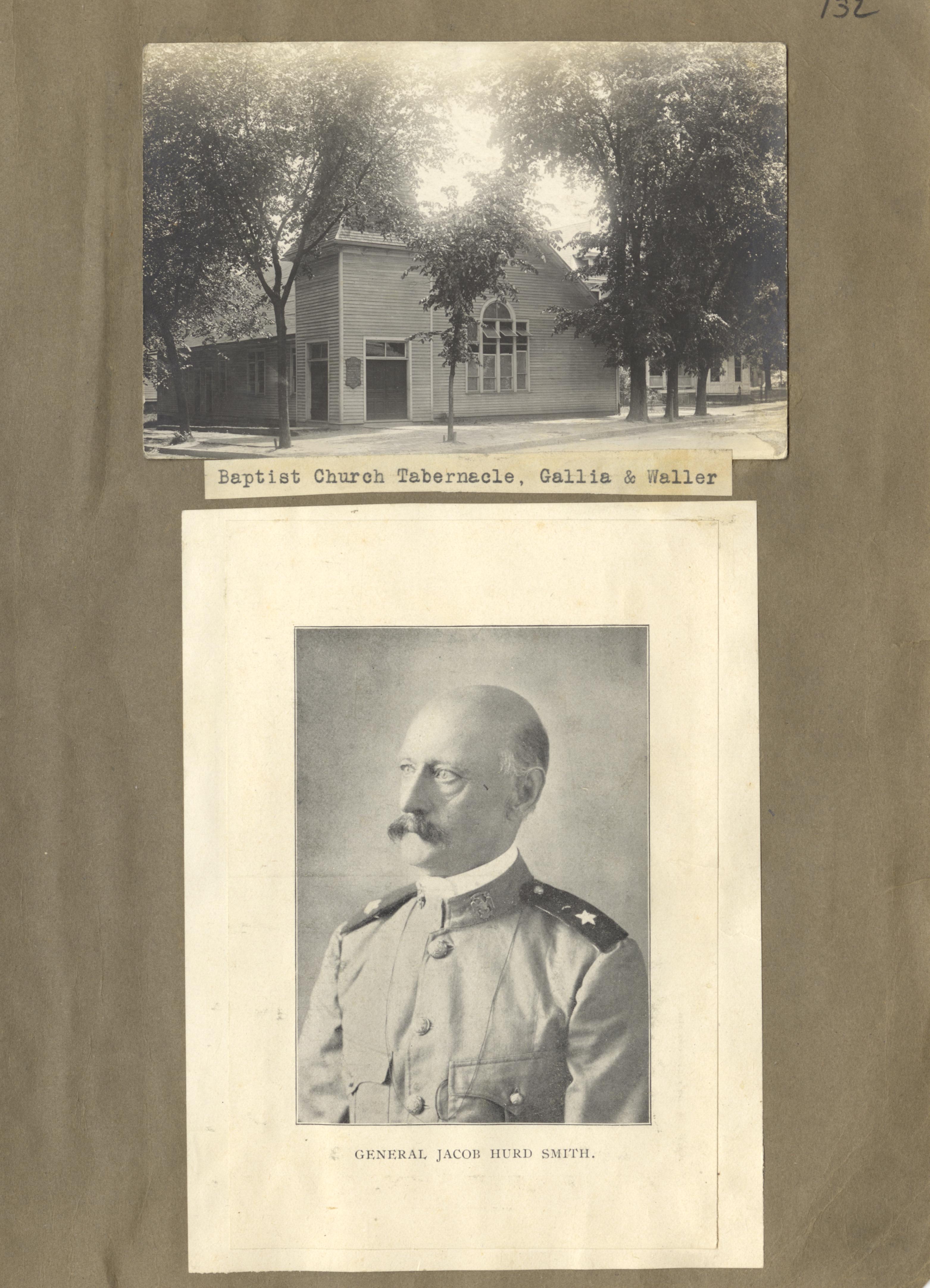 - Photo image of scanned scrapbook page. Pictured is the Baptist Church Tabernacle at the corner of Gallia and Waller Streets and General Jacob Hurd Smith