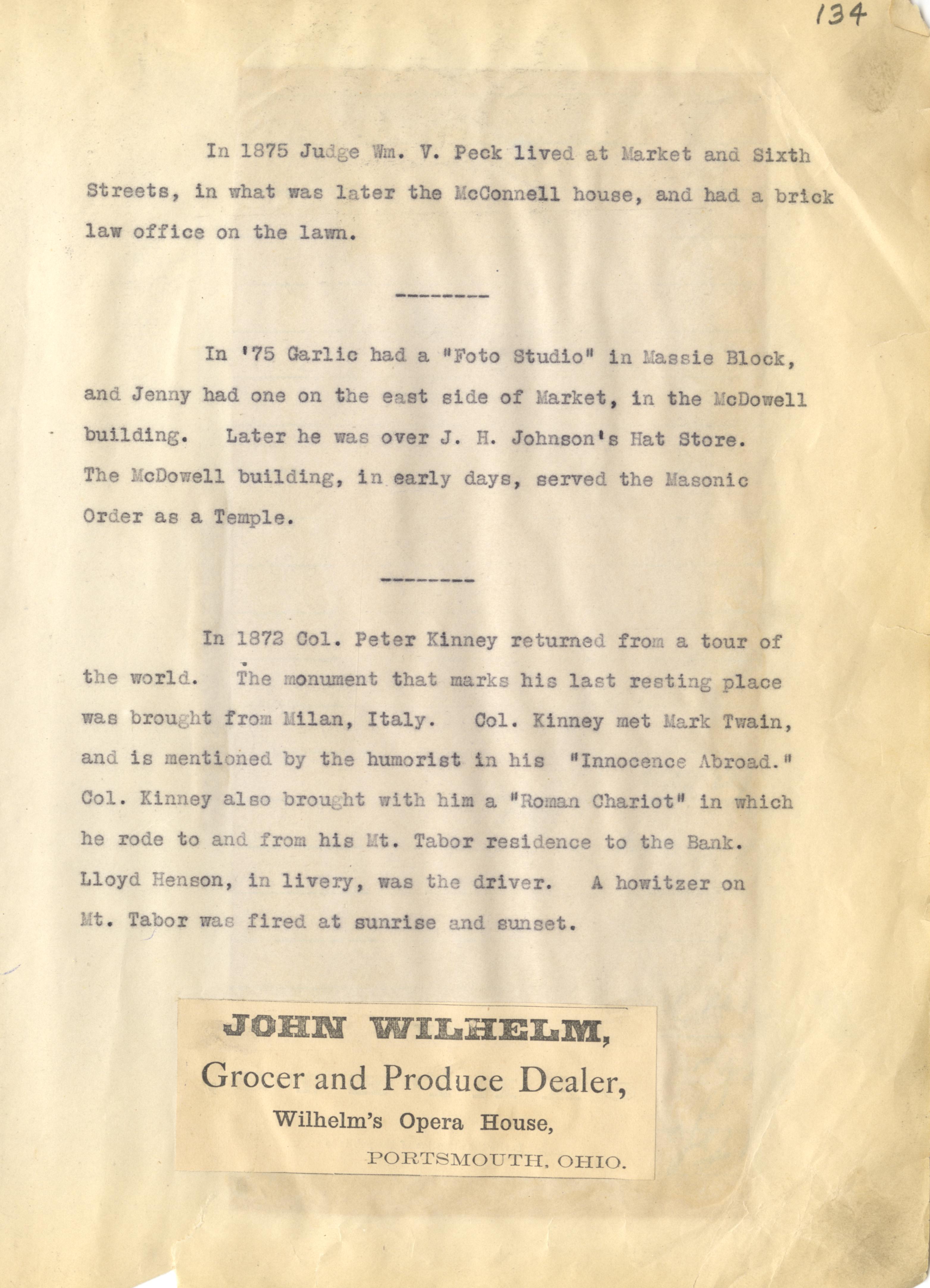 - Photo image of scanned scrapbook page. Pictured is a typed page giving some details about Portsmouth historical musings. Judge William V. Peck; the McConnell House; Garlic's Foto (Photo) Studio; McDowell Building; Jenny; J. H. Johnson's Hat Store; Masonic Order as a Temple in the McDowell Building; Colonel Peter Kinney's tour of the world.