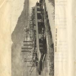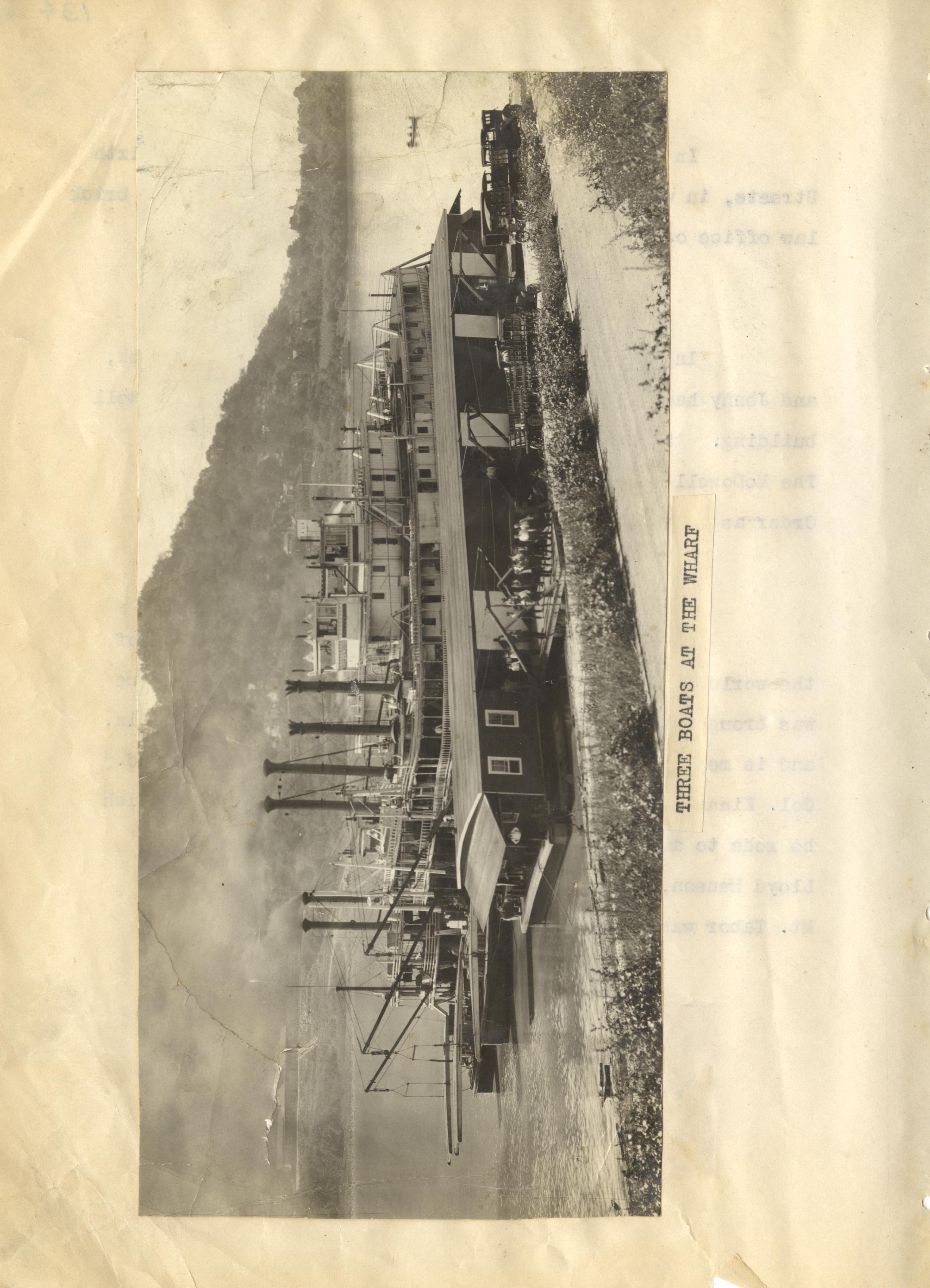 - Photo image of scanned scrapbook page. Pictured is a black and white photo image of three boats at the Portsmouth Wharf on the Ohio River.