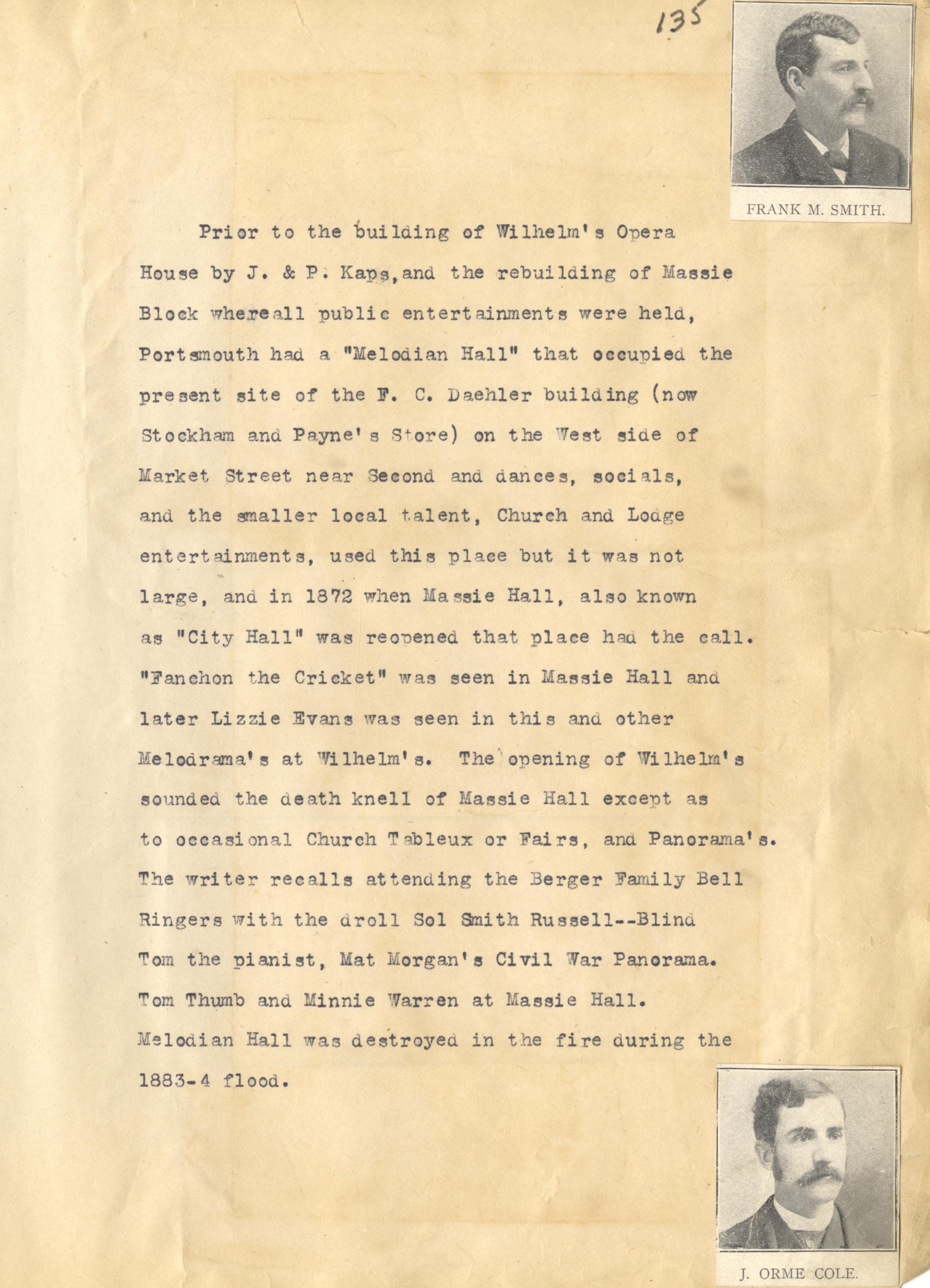 - Photo image of scanned scrapbook page. Pictured is a typed page giving details about local businesses and entertainment that went on in Portsmouth. Wilhelm's Opera House; J & P Kaps; Massie Block; Melodian Hall; F. C. Daehler; Stockham and Payne's Store; City Hall; Sol. Smith Russell; ; Lizzie Evans; Church of Tableaux; Berger Family Ball; Mat Morgan's Civil War Panorama; Tom Thumb; Minnie Warren.