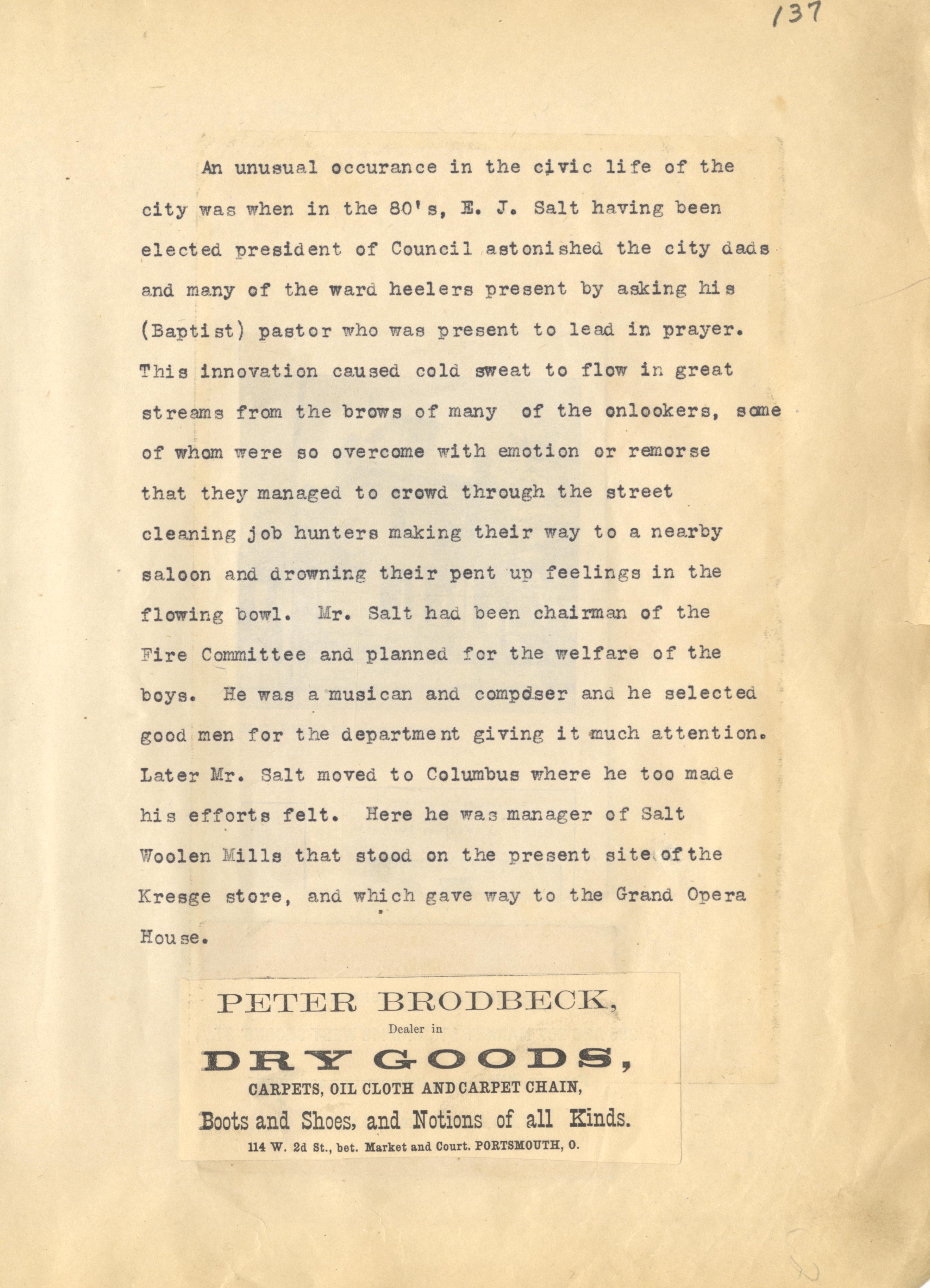 Henry A. Lorberg , “Story About E. J. Salt; Ad for Peter Brodbeck, Dealer in Dry Goods,” Scioto County Public Library Local History Digital Collection, accessed December 17, 2025, https://sciotolibrary.org/history/items/show/21360.