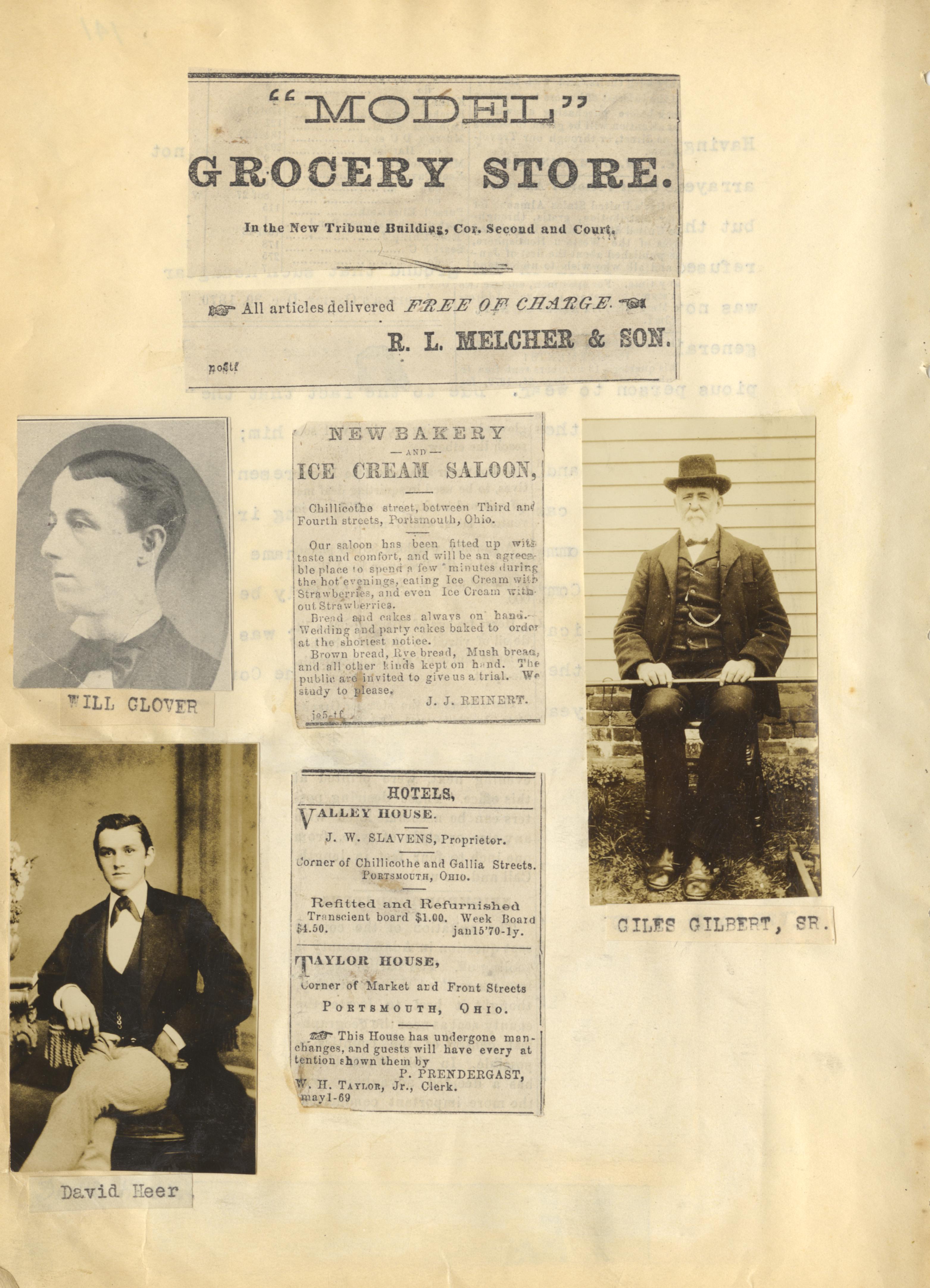 - Photo image of scanned scrapbook page. Pictured is The "Model" Grocery Store at the corner of Second (2nd) and Court Streets; Bakery and Ice Cream Saloon on Chillicothe Street; Valley House at the corner of Chillicothe and Gallia Streets; Taylor house at the corner of Market and Front Streets; Will Glover; David Heer; Giles Gilbert Sr.