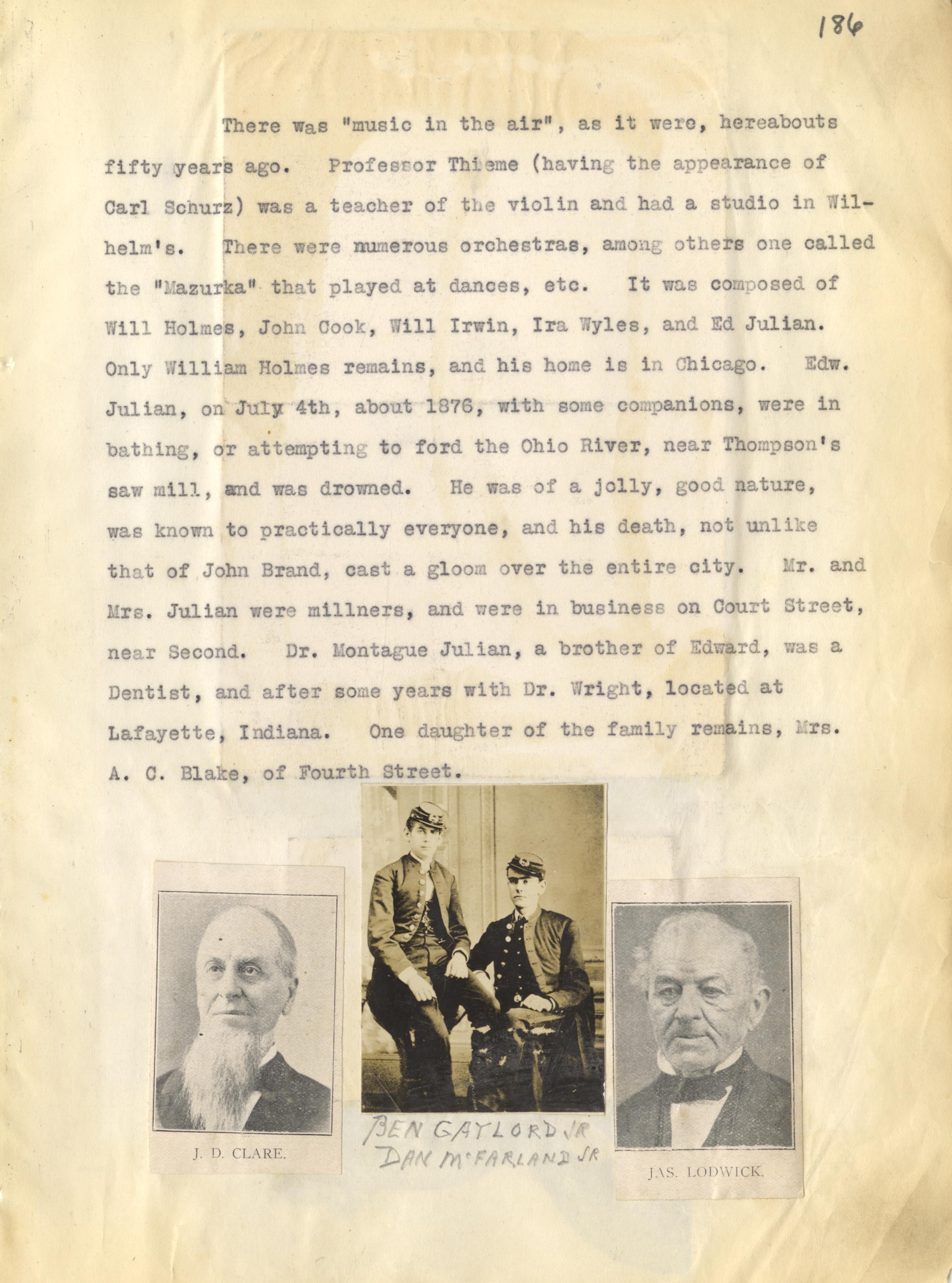 - Photo image of scanned scrapbook page. Pictured is typed page giving details about musical groups in Portsmouth. Professor Thime, violin teacher with a studio at Wilhelm's; "Mazurka;" Will Holmes; John Cook; Will Irwin; Ira Wyles; Edward Julian; Ohio River; Thompson's Saw Mill; John Brand; Dr. Montague Julian, dentist; Dr. Wright; Mrs. A. C. Blake.