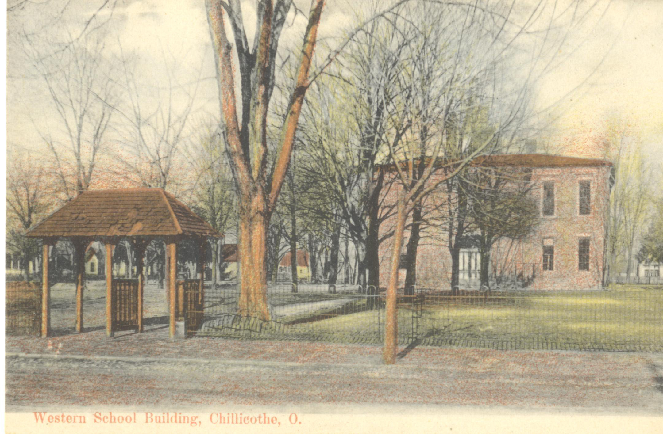 - Colorized photo image of the Western School Building and grounds in Chillicothe, Ohio.