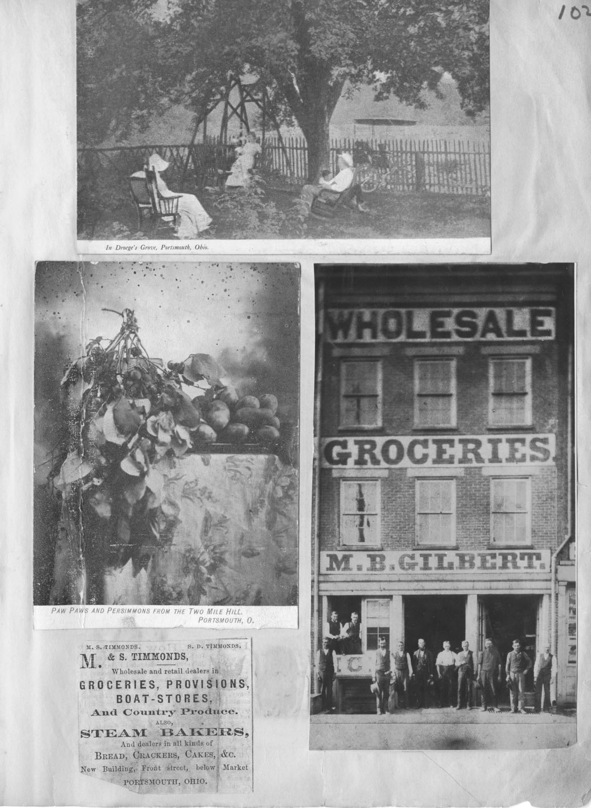 - Scanned page 102 from Henry A. Lorberg scrapbook containing black & whiteimage of three women sitting under a tree at "Droege's Grove"; Paw Paws and Persimmons from the Two Mile Hill; M.B. Gilbert Wholesale Groceries, 199-203 W. Front Street; and a clipping of an ad for M. & S. Timmonds, wholesale and retail.