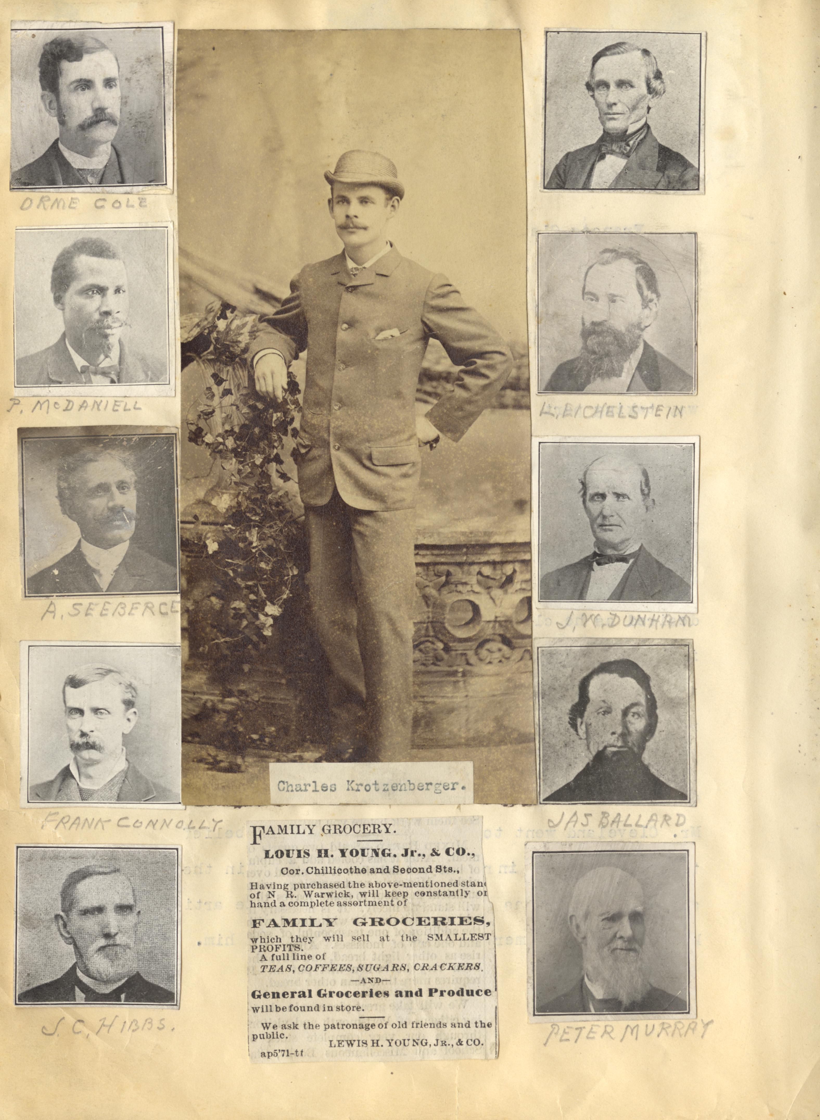 - Scanned unnumbered page from Henry A. Lorberg scrapbook containing black & white images of Orme Cole; P. McDaniell; A. Seeberce; Frank Connolly; L. Lichelstein; J. H. Dunham; James Ballard; J. C. Hibbs; and Peter Murray. Sepia image of Charles Krotzenberger. Clipped ad for Louis H. Young, Jr., & Company Family Grocery.