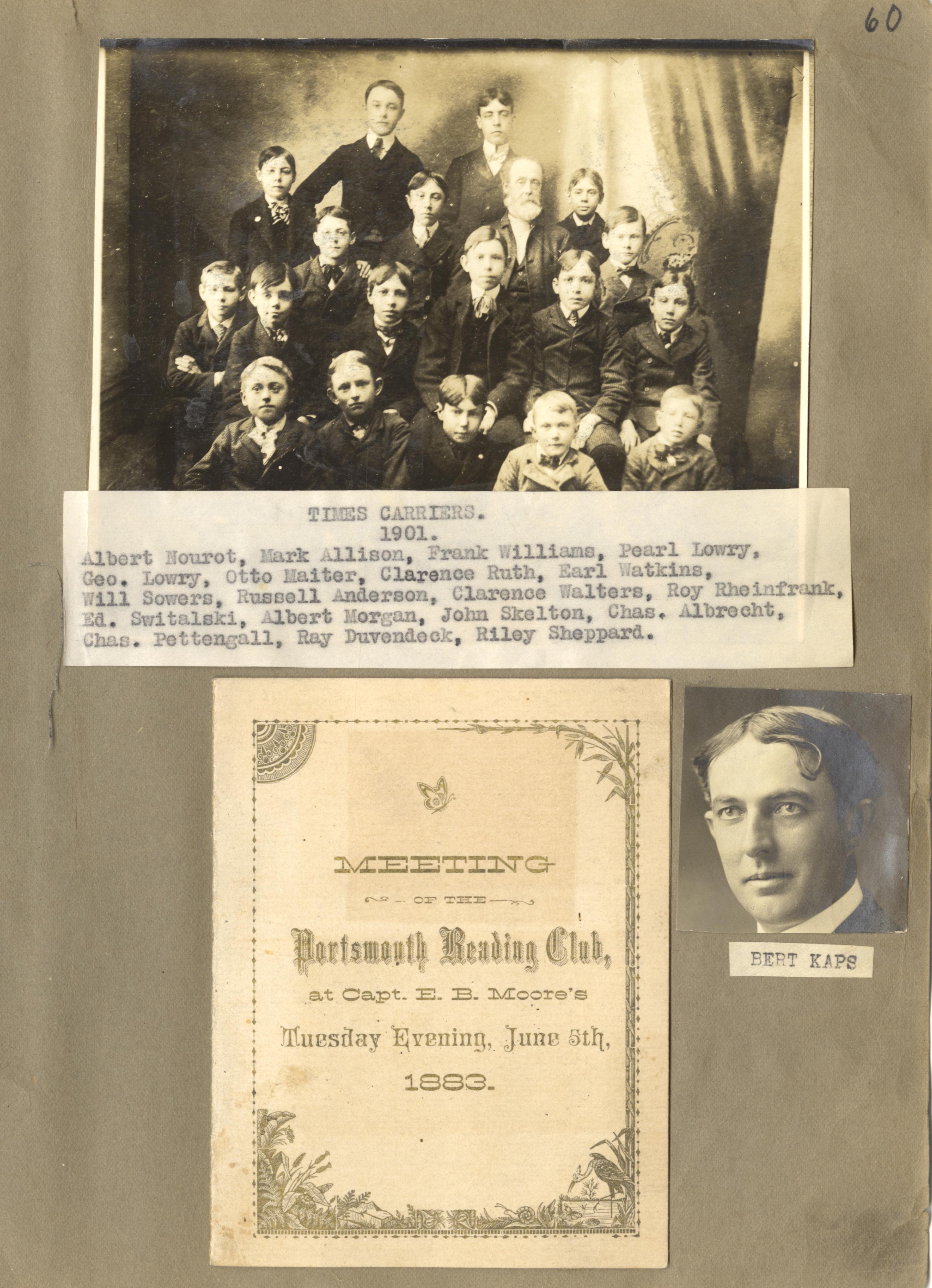 - Scanned page 60 from Henry A. Lorberg scrapbook containing black & white image of the Times Carriers in 1901: Albert Hourot; Mark Allison; Frank Williams; Pearl Lowry; Geo. Lowry; Otto Maiter; Clarence Ruth; Earl Watkins; Roy Rheinfrank; Ed. Switaleki; Albert Morgan; John Skelton; Chas. Albrecht; Chas. Pettengall; Ray Duvendeck; Riley Sheppard. Meeting announcement for the Portsmouth Reading Club at Capt. E. B. Moore's in 1883. Black & white image of Bert Kaps.