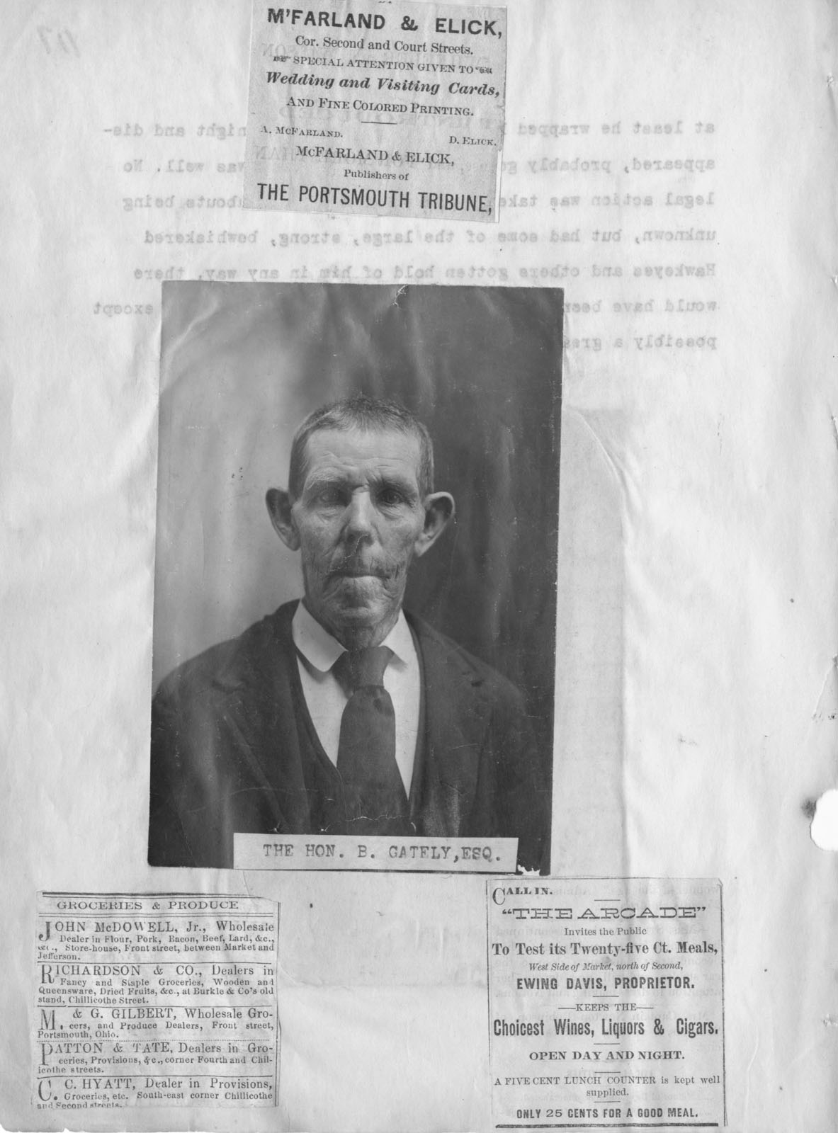 - Scanned unnumbered page from Henry A. Lorberg scrapbook containing black & white image of Honorable B. Gately, Esq. Clippings of newspaper ads for M'Farland & Elick, The Portsmouth Tribune; John McDowll, Jr., Wholesale; Richardson & Co.; M. & G. Gilbert, Wholesale Grocers; Patton & Tate, groceries; C. C. Hyatt, Groceries; The Arcade.