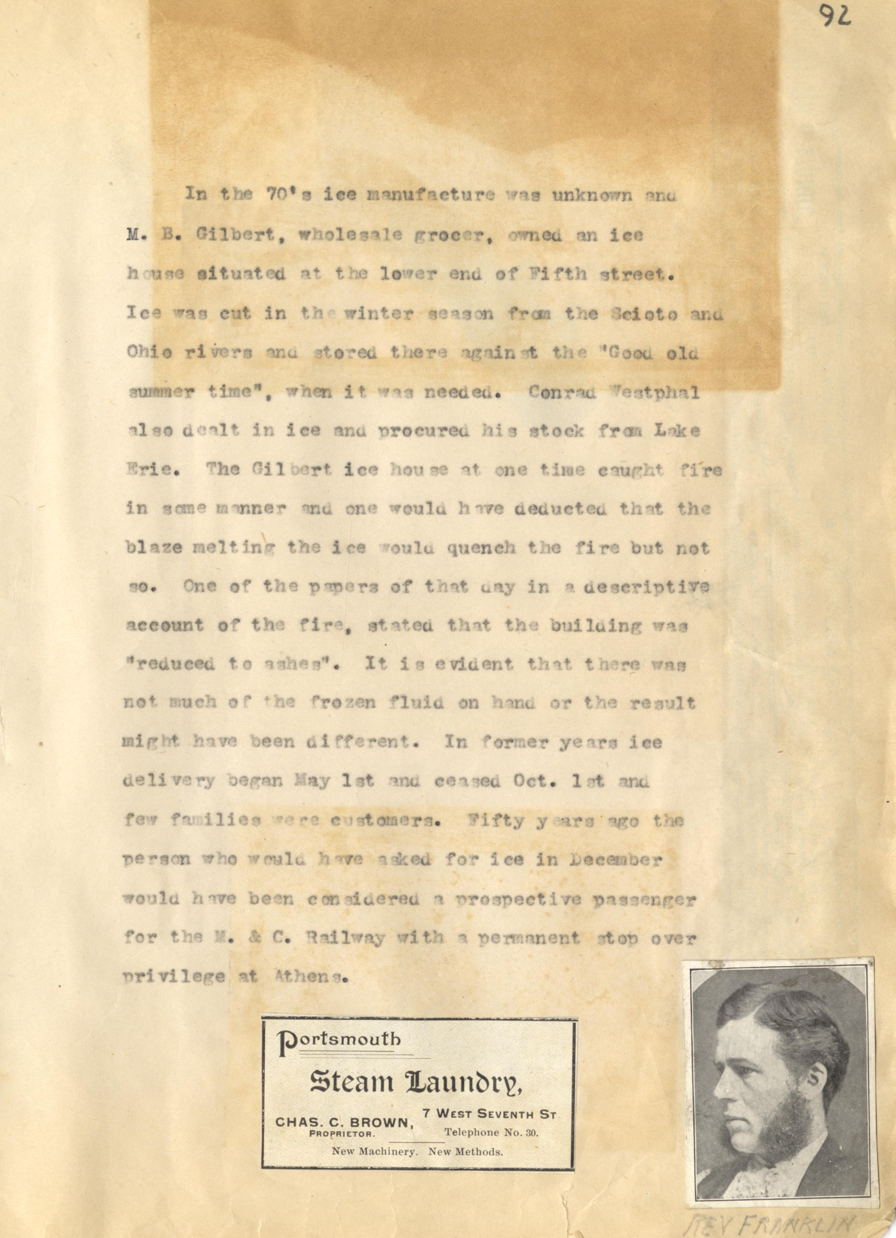 - Scanned page 92 from Henry A. Lorberg scrapbook containing a typed text narrative about lightning rods. A business clipping for Portsmouth Steam Laundry, Chas. C. Brown. A black & white image of Rev. Franklin.