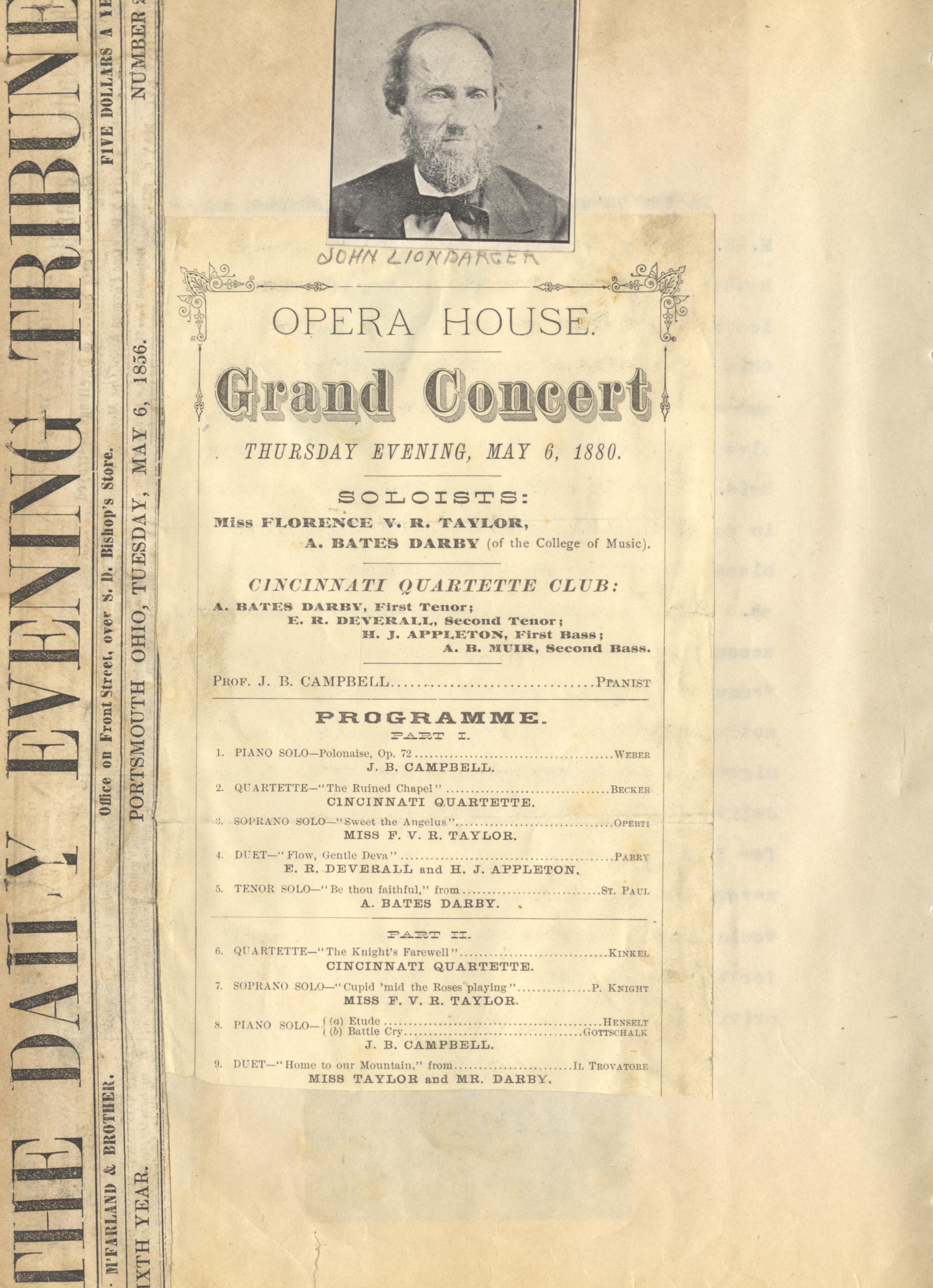 Henry A. Lorberg, “Daily Evening Tribune; John Liondarger; Opera House Grand Concert Programme,” Scioto County Public Library Local History Digital Collection, accessed December 19, 2025, https://sciotolibrary.org/history/items/show/22024.