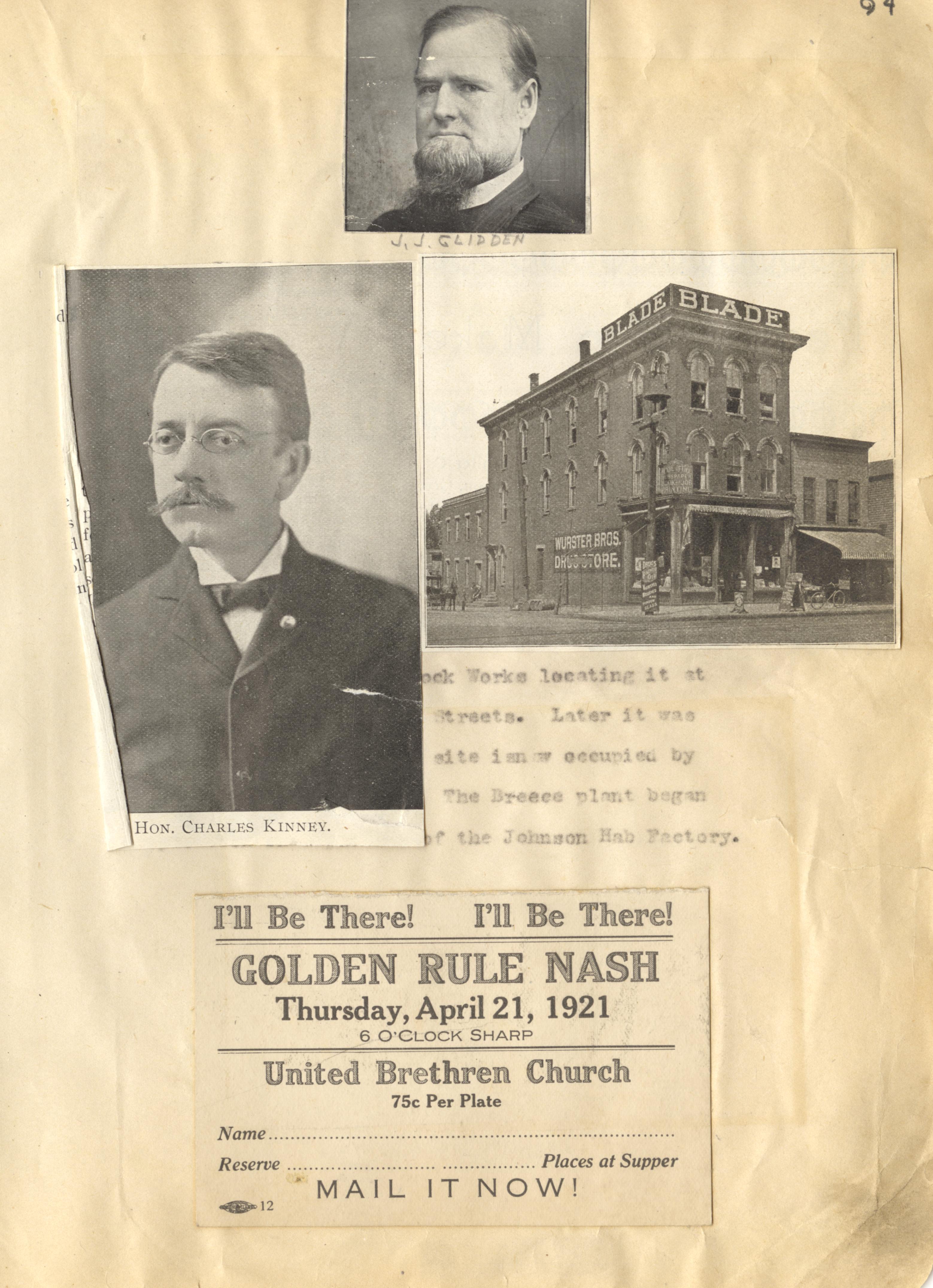 - Scanned page 94 from Henry A. Lorberg scrapbook containing black & white images of J. J. Glidden; Honorable Charles Kinney; The Blade building; Golden Rule Nash at United Brethren Church reservation card.
