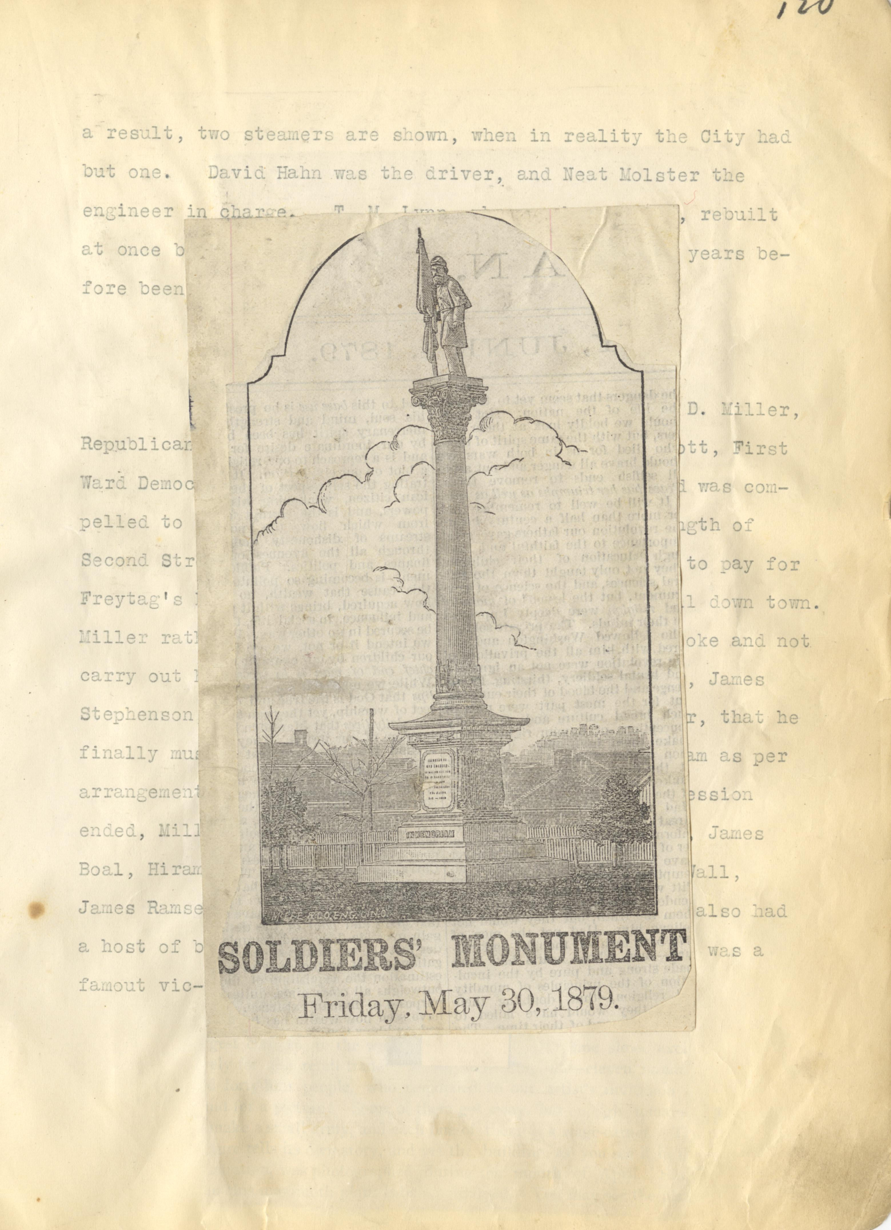 - Scanned page 120 from Henry A. Lorberg scrapbook containing black & white illustration of Soldiers' Monument, dedicated in Tracy Park Friday, May 30, 1879.
