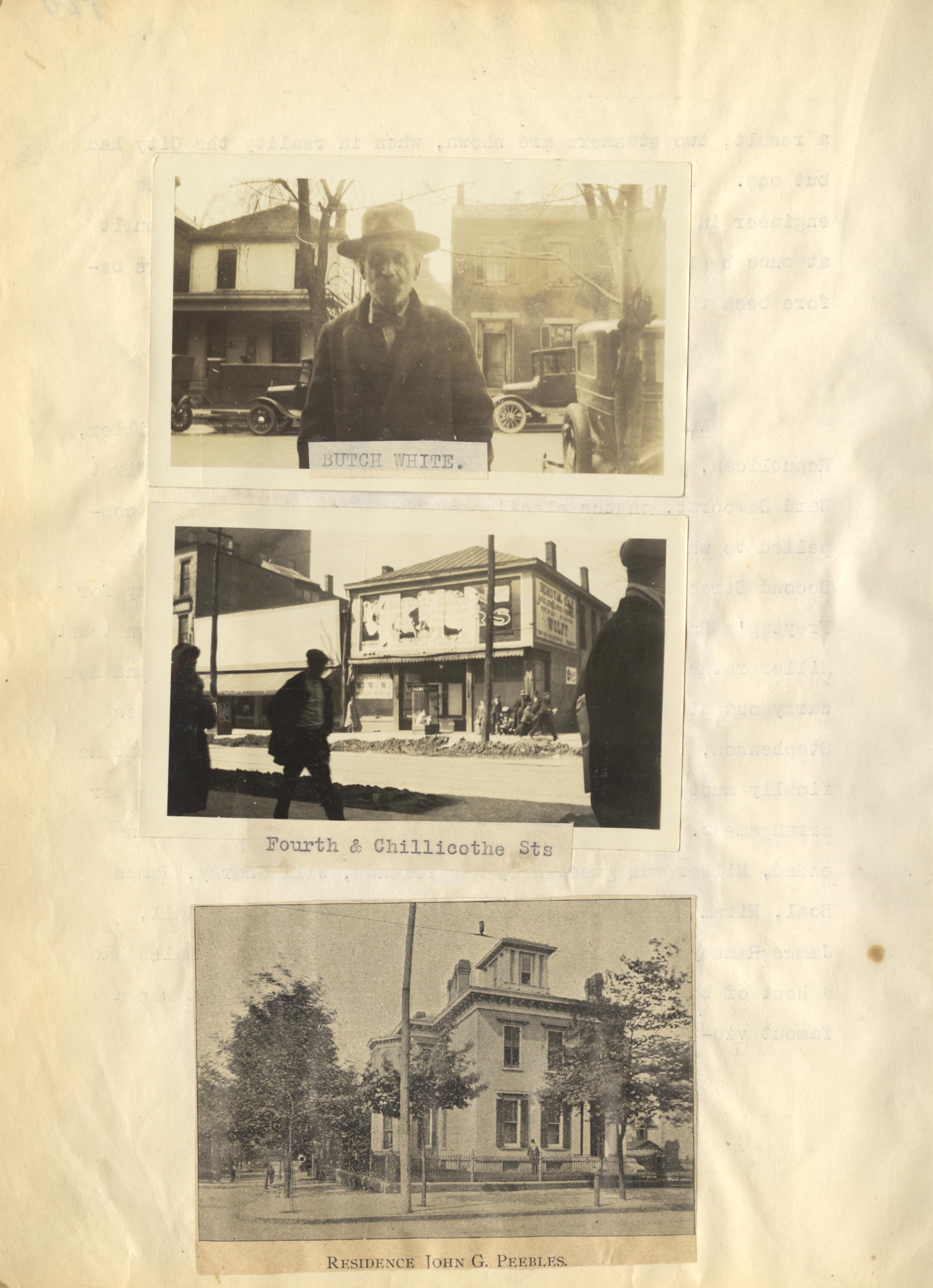 - Scanned unnumbered page from Henry A. Lorberg scrapbook containing black & white images of Butch White; Fourth & Chillicothe Sts.; Residence John G. Peebles.