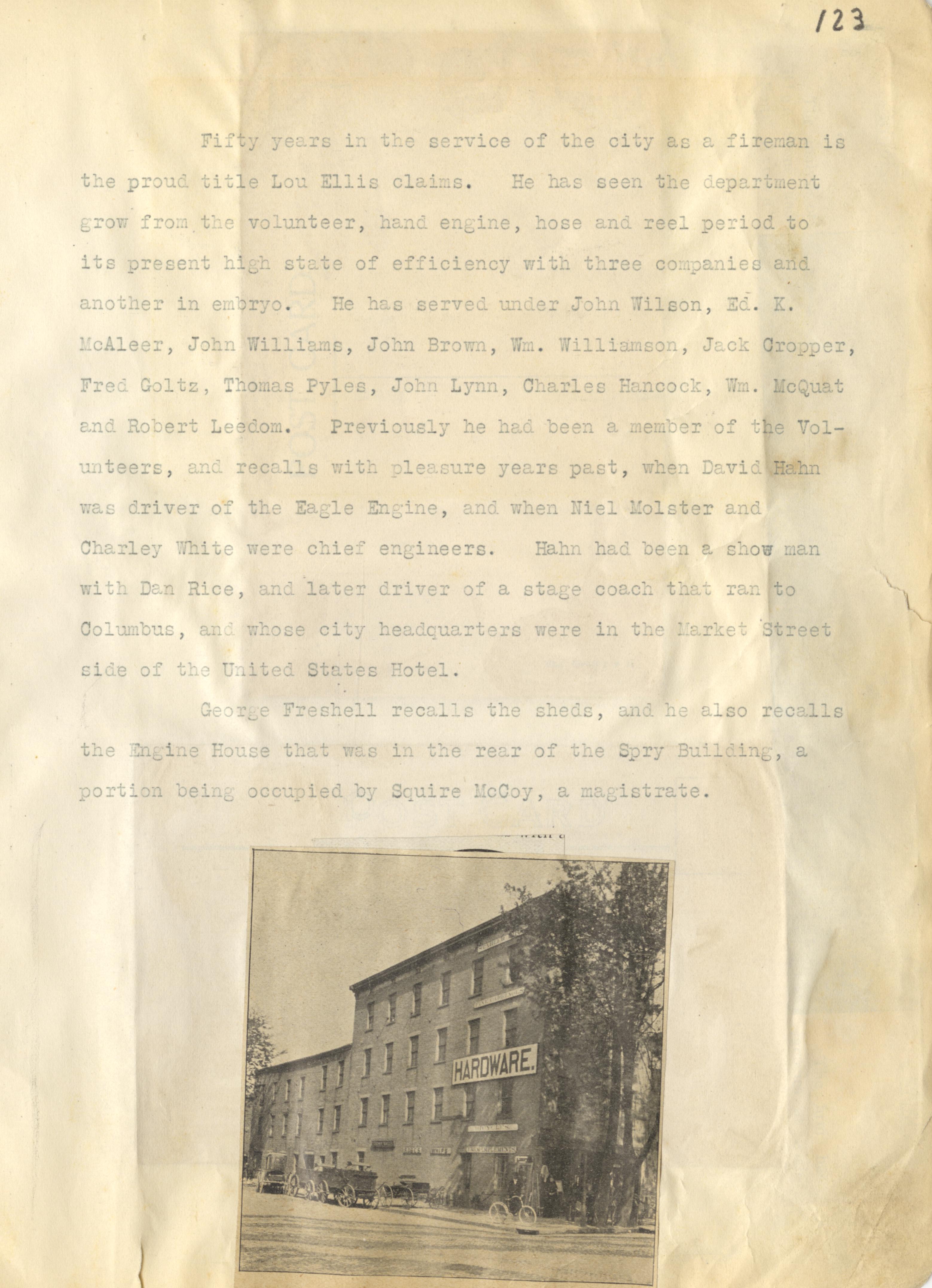 - Scanned page 123 from Henry A. Lorberg scrapbook containing a typed text narrative about fireman Lou Ellis. Black & white image of a hardware store.