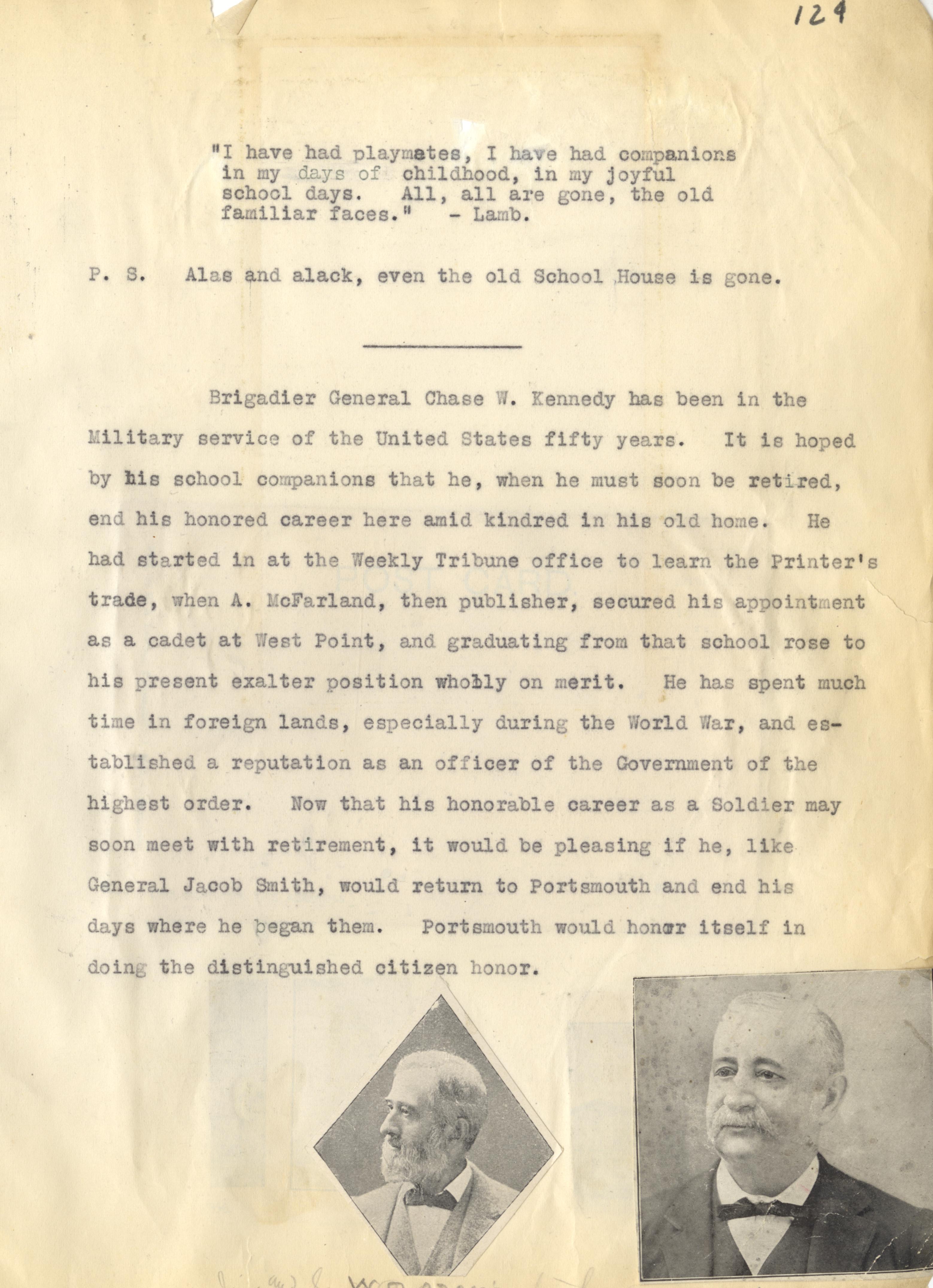 - Scanned page 124 from Henry A. Lorberg scrapbook containing typed text narrative about Brigadier General Chase W. Kennedy and two black & white images of unidentified men. A. McFarland, publisher of the Weekly Tribune; World War