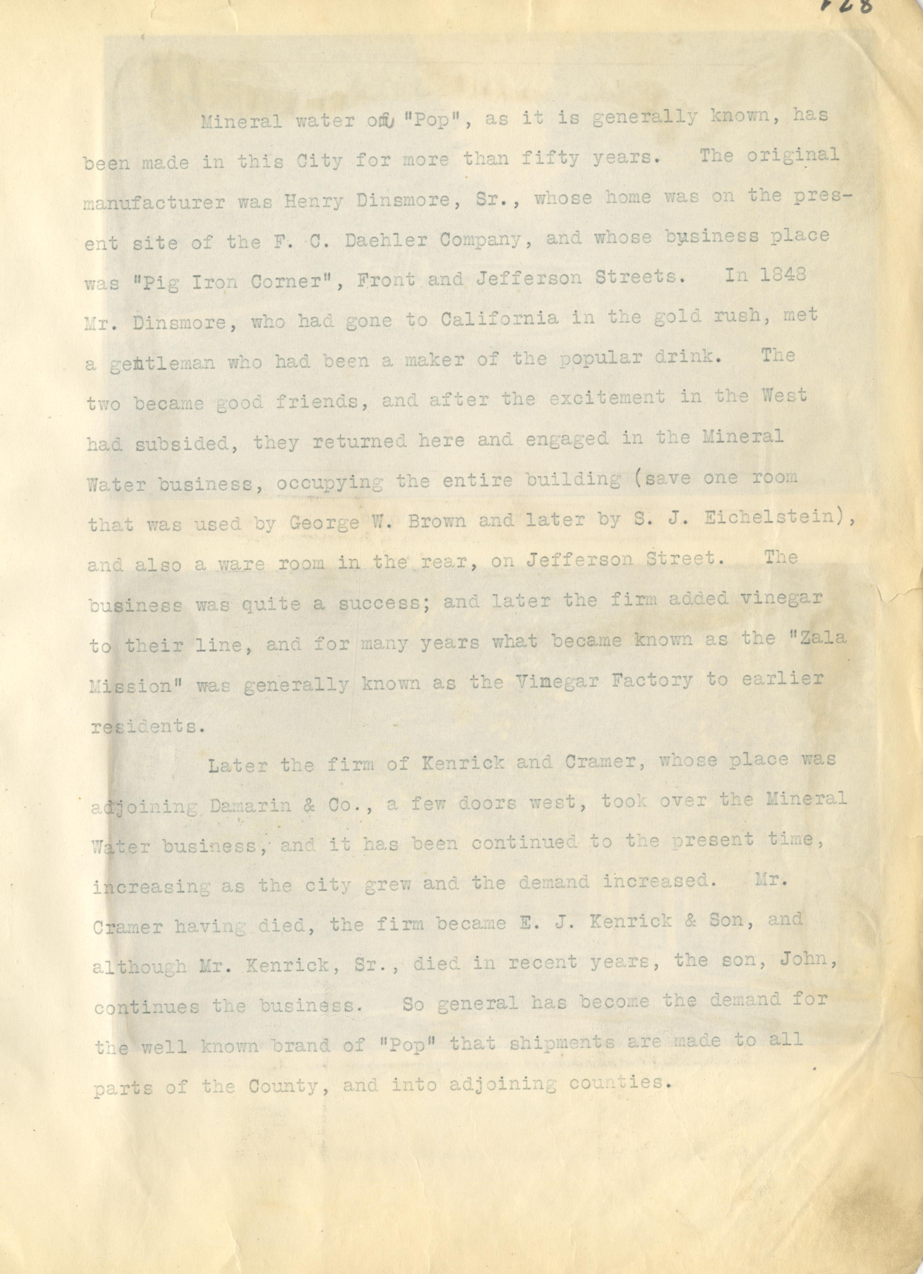 - Scanned page 128 from Henry A. Lorberg scrapbook containing a typed text narrative about the manufacturing of mineral water or "pop".
