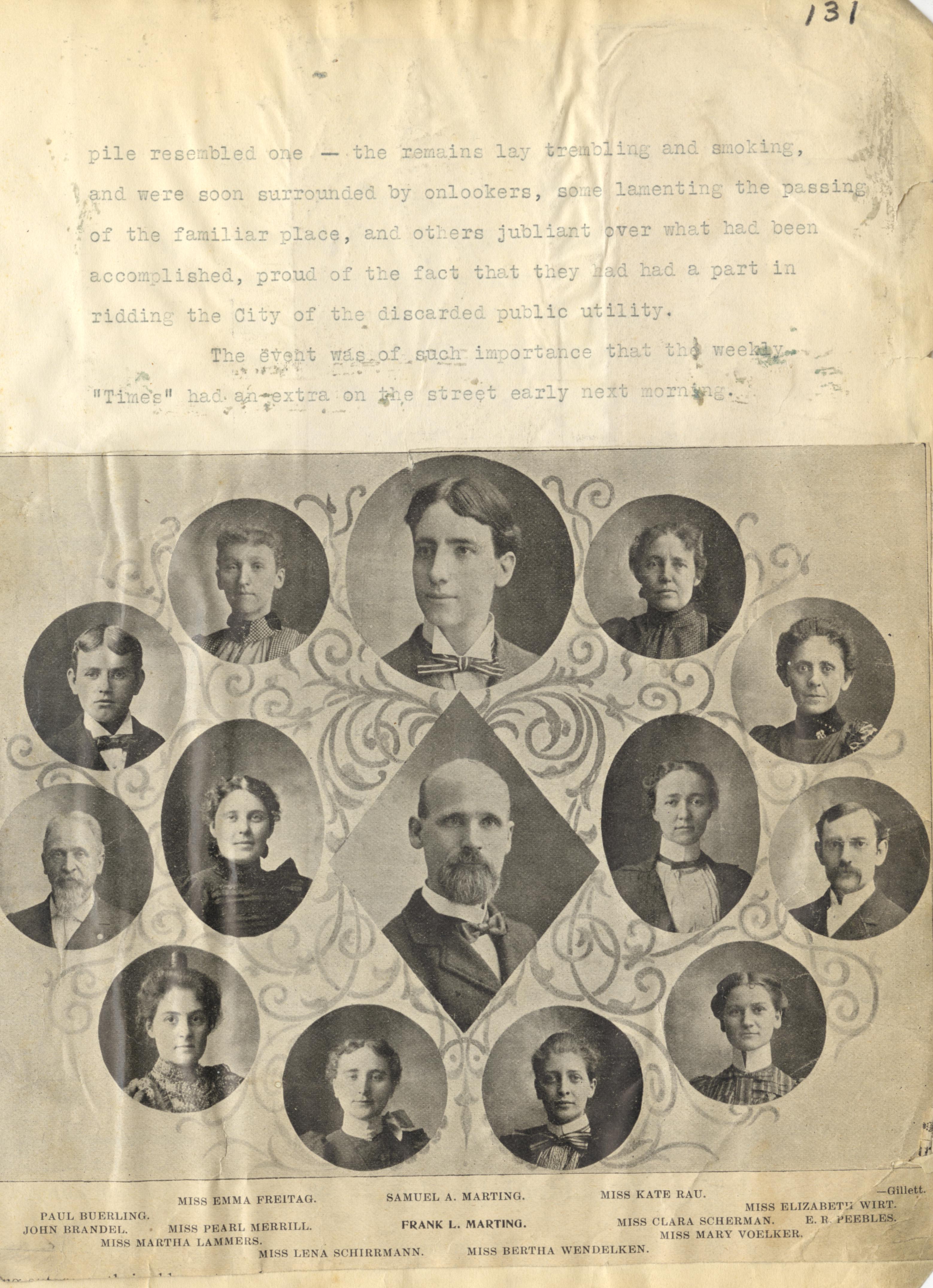 - Scanned unnumbered page from Henry A. Lorberg scrapbook containing a collection of black & white photographs: Miss Emma Freitag, Samuel A. Marting, Miss Kate Rau, Paul Buerling, Miss Elizabeth Wirt, John Brandell, Miss Pearl Merrill, Frank L. Marting, Miss Clara Scherman, E.R. Peebles, Miss Martha Lammers, Miss Mary Voelker, Miss Lena Schirrmann, Miss Bertha Wendelken.