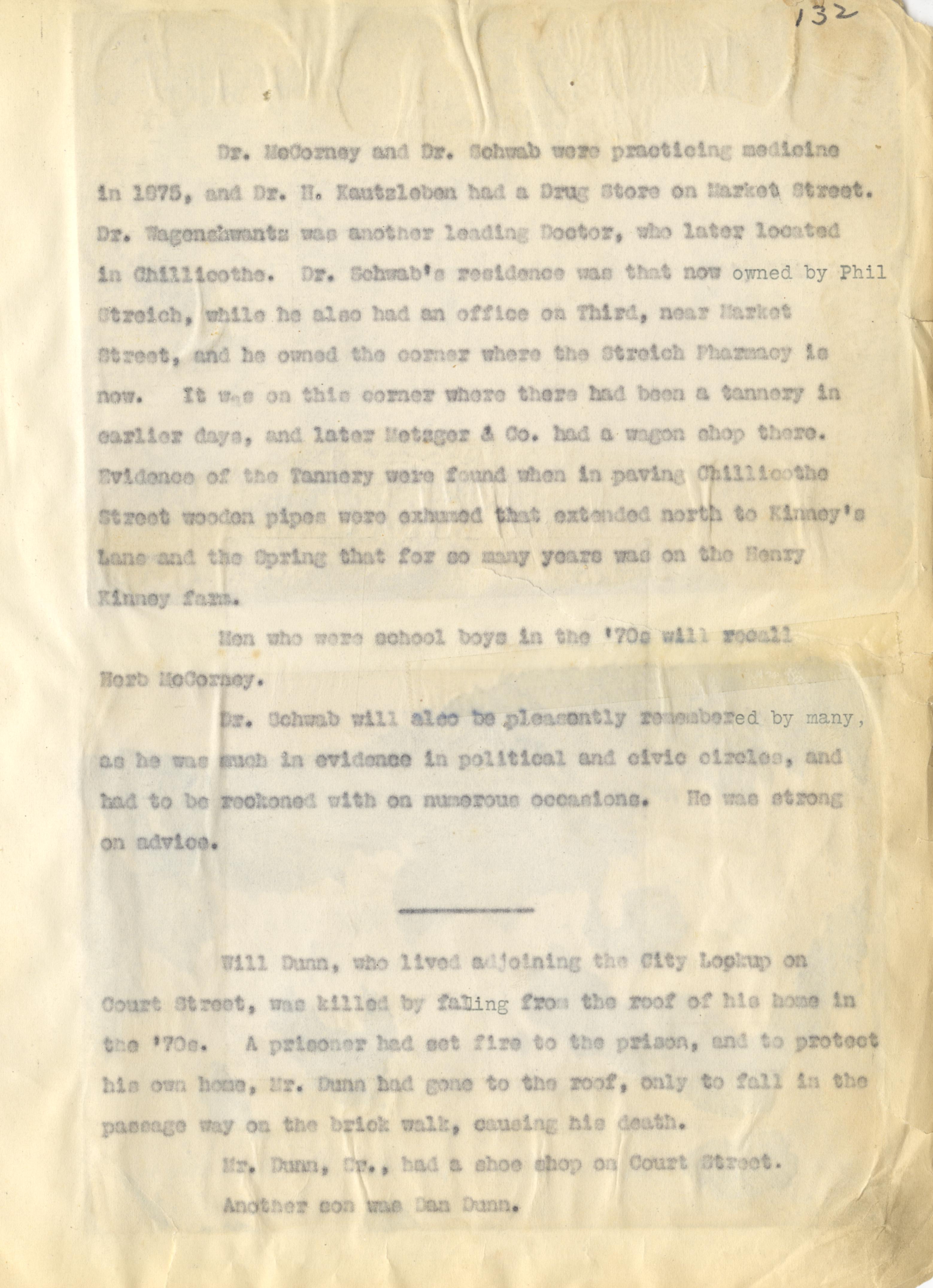 - Scanned page 132 from Henry A. Lorberg scrapbook containing typed text about Dr. McCorney and Dr. Schwab; and Will Dunn's death.