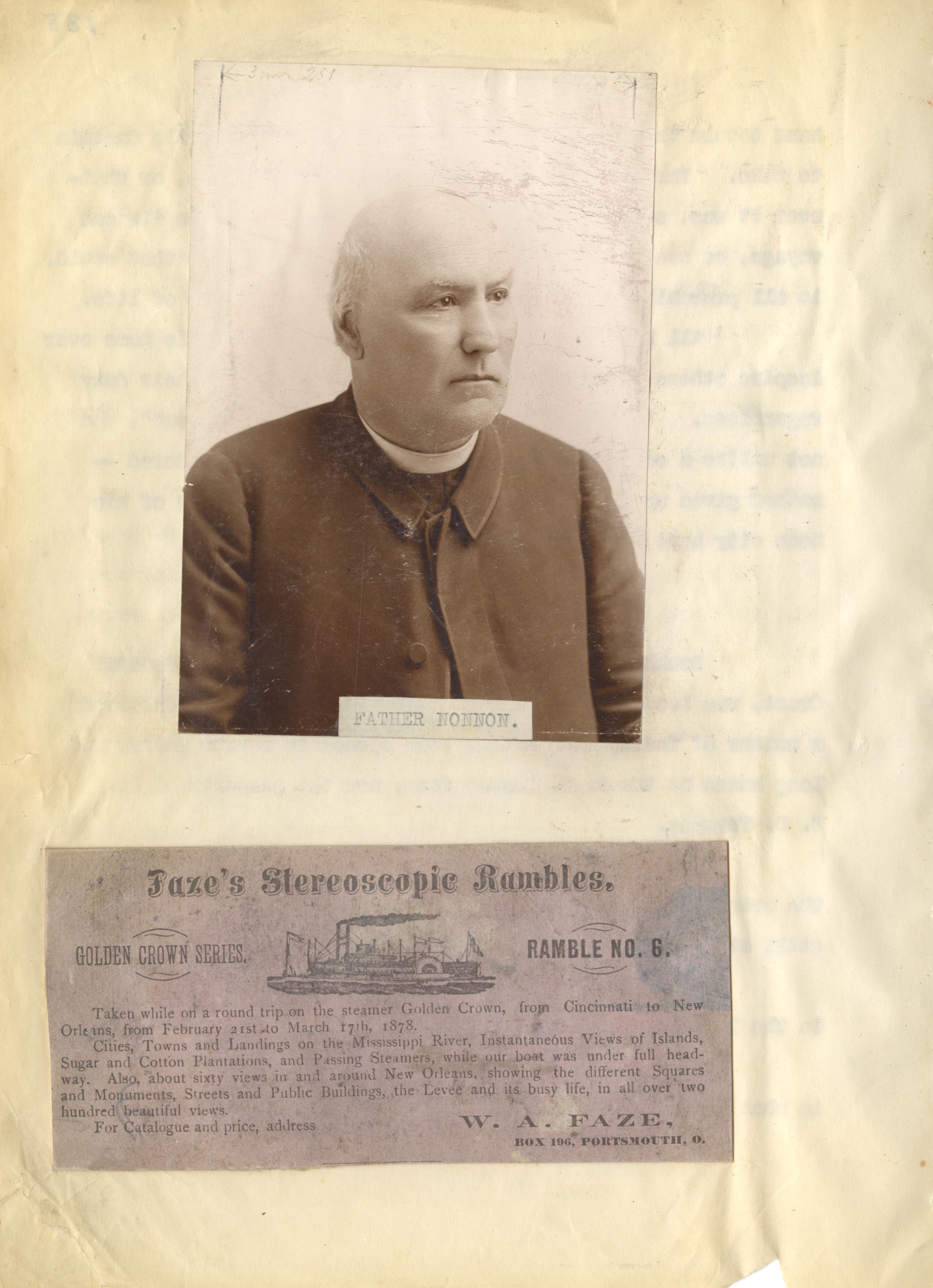 - Scanned unnumbered page from Henry A. Lorberg scrapbook containing a black & white image of Father Nonnon; and a business clipping for Faze's Stereoscopic Rambles, W. A. Faze.