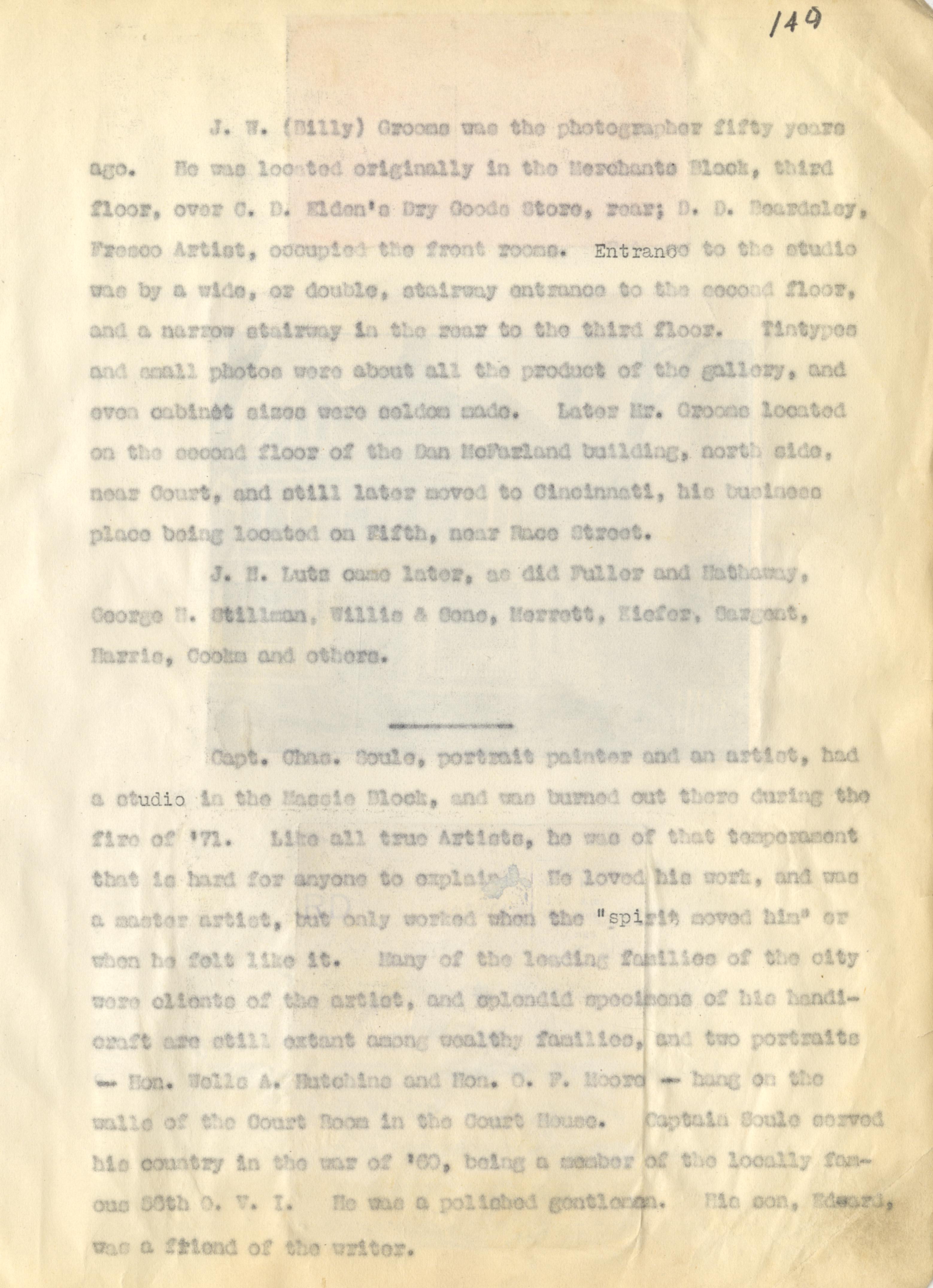 - Scanned page 149 from Henry A. Lorberg scrapbook containing typed text narrative about the early photographers and artists of Portsmouth. J. W. Grooms; C. D. Elden's Dry Goods Store; D. D. Beardeley; Captain Charles Soule; J. H. Lutz; George H. Stillman; O. F. Moore