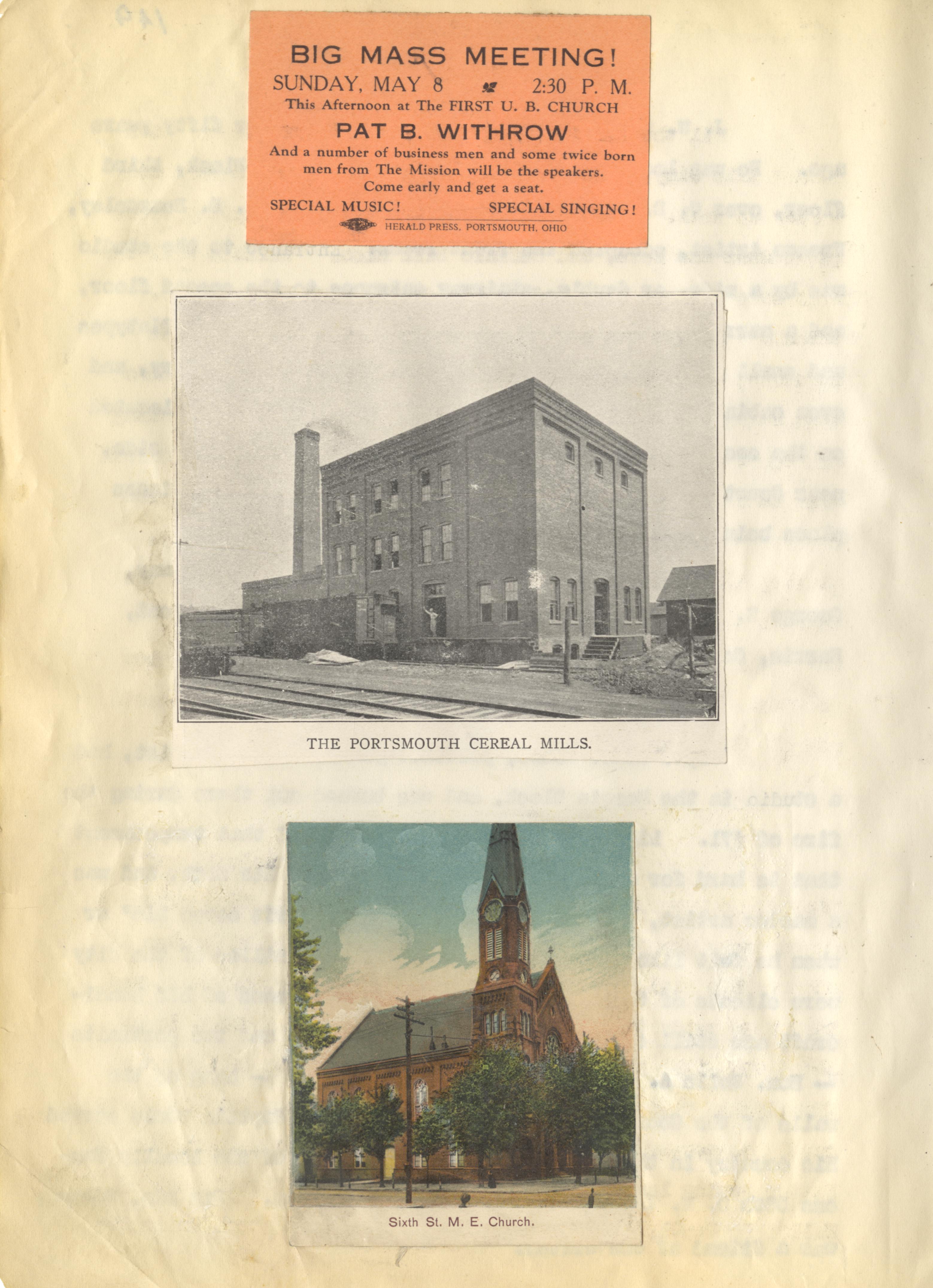 Henry A. Lorberg, “Big Mass Meeting at the First U. B. Church; The Portsmouth Cereal Mills; Sixth St. M. E. Church.,” Scioto County Public Library Local History Digital Collection, accessed December 17, 2025, https://sciotolibrary.org/history/items/show/22139.