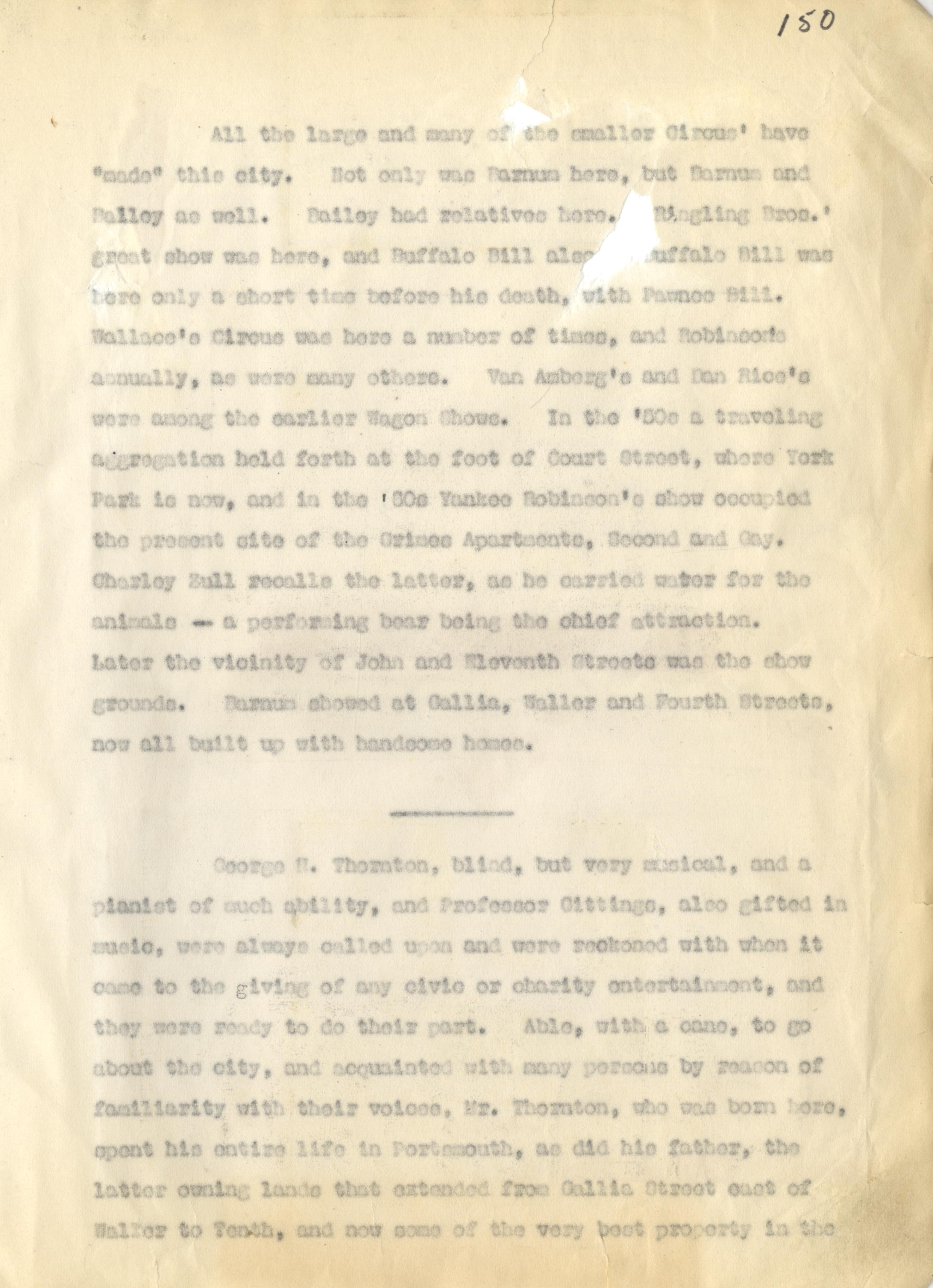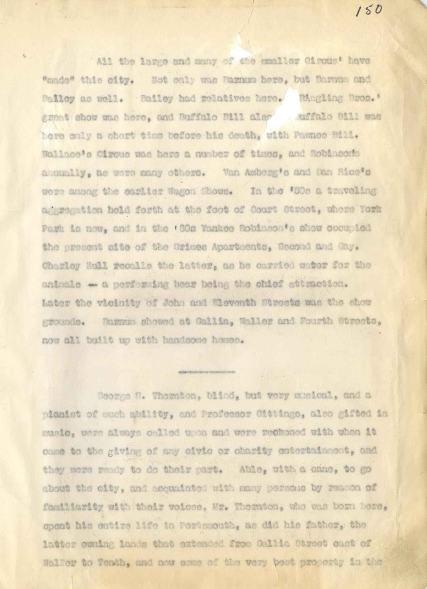 - Scanned page from Henry A. Lorberg scrapbook containing a typed text narrative about circuses and musicals that visited Portsmouth.