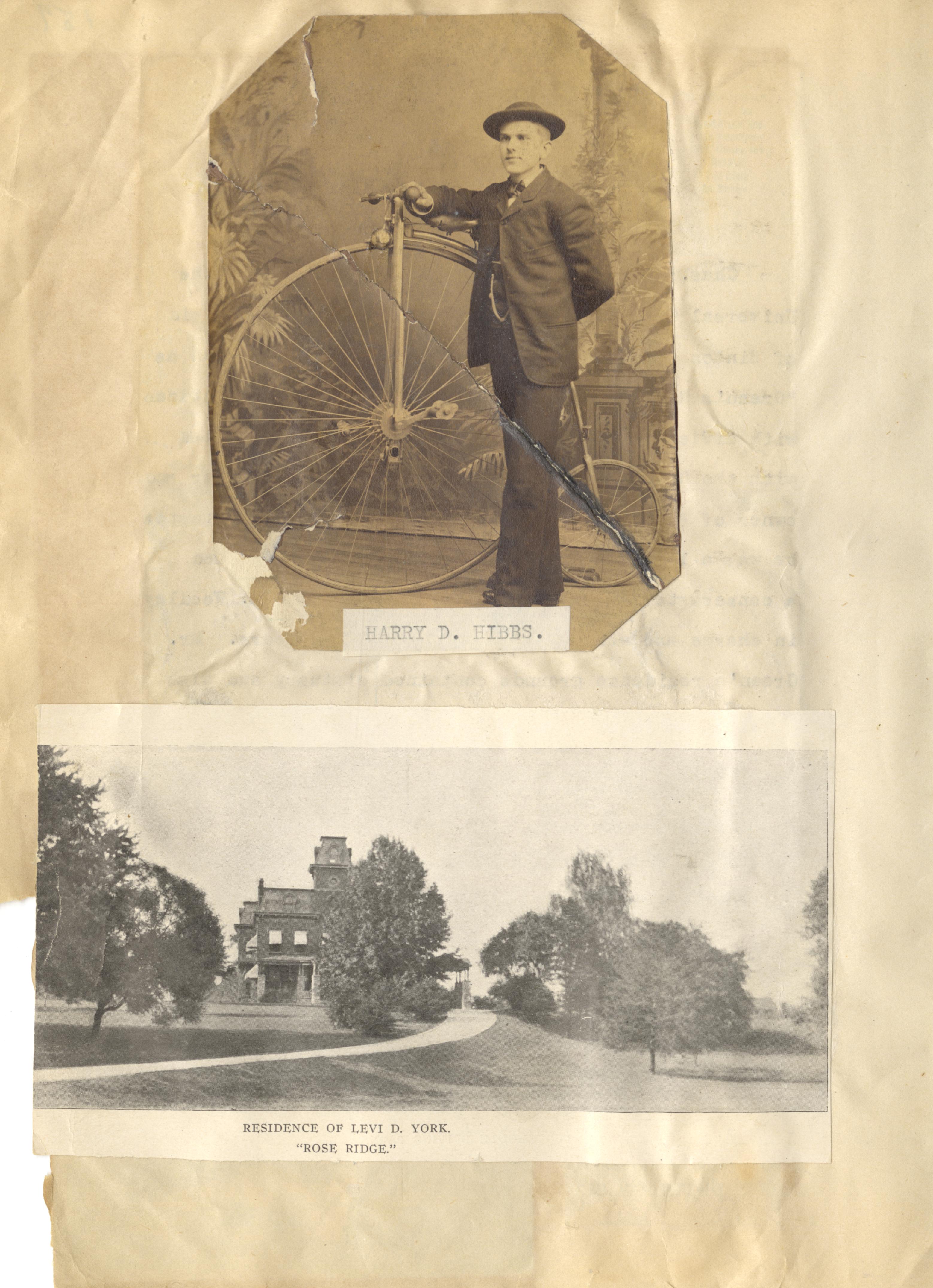 - Scanned unnumbered page from Henry A. Lorberg scrapbook containing black & white images of Harry D. Hibbs; Residence of Levi D. York "Rose Ridge"