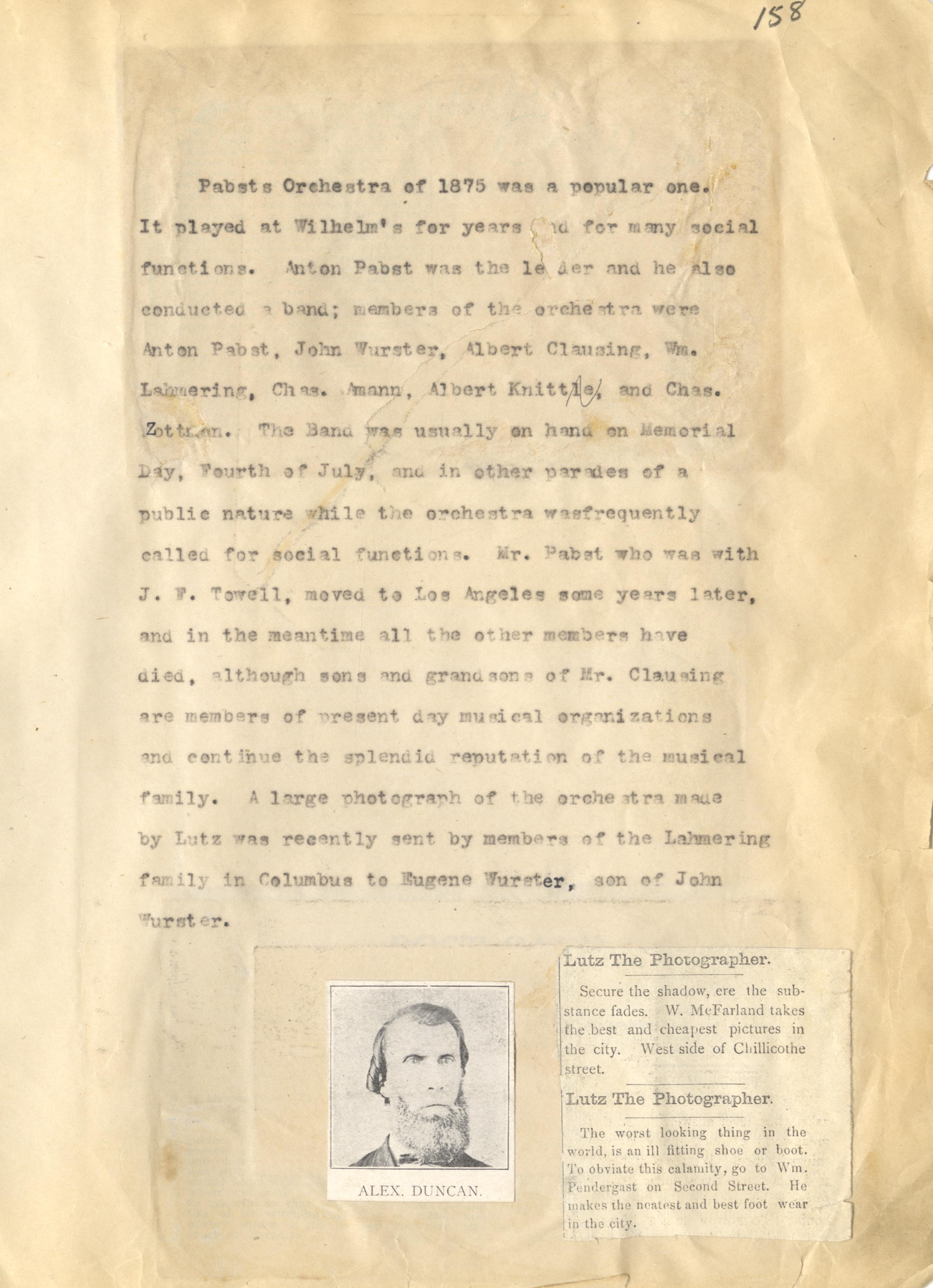 - Scanned page 158 from Henry A. Lorberg scrapbook containing typed text about Pabst's Orchestra. Wilhelm's; Anton Pabst; John Wurster; Albert Clausing; William Lahmering; Charles Amann; Albert Knittle; Charles Zottman; J. F. Towell; Eugene Wurtster. Also shows: black & white image of Alex Duncan; business clipping for Lutz the Photographer