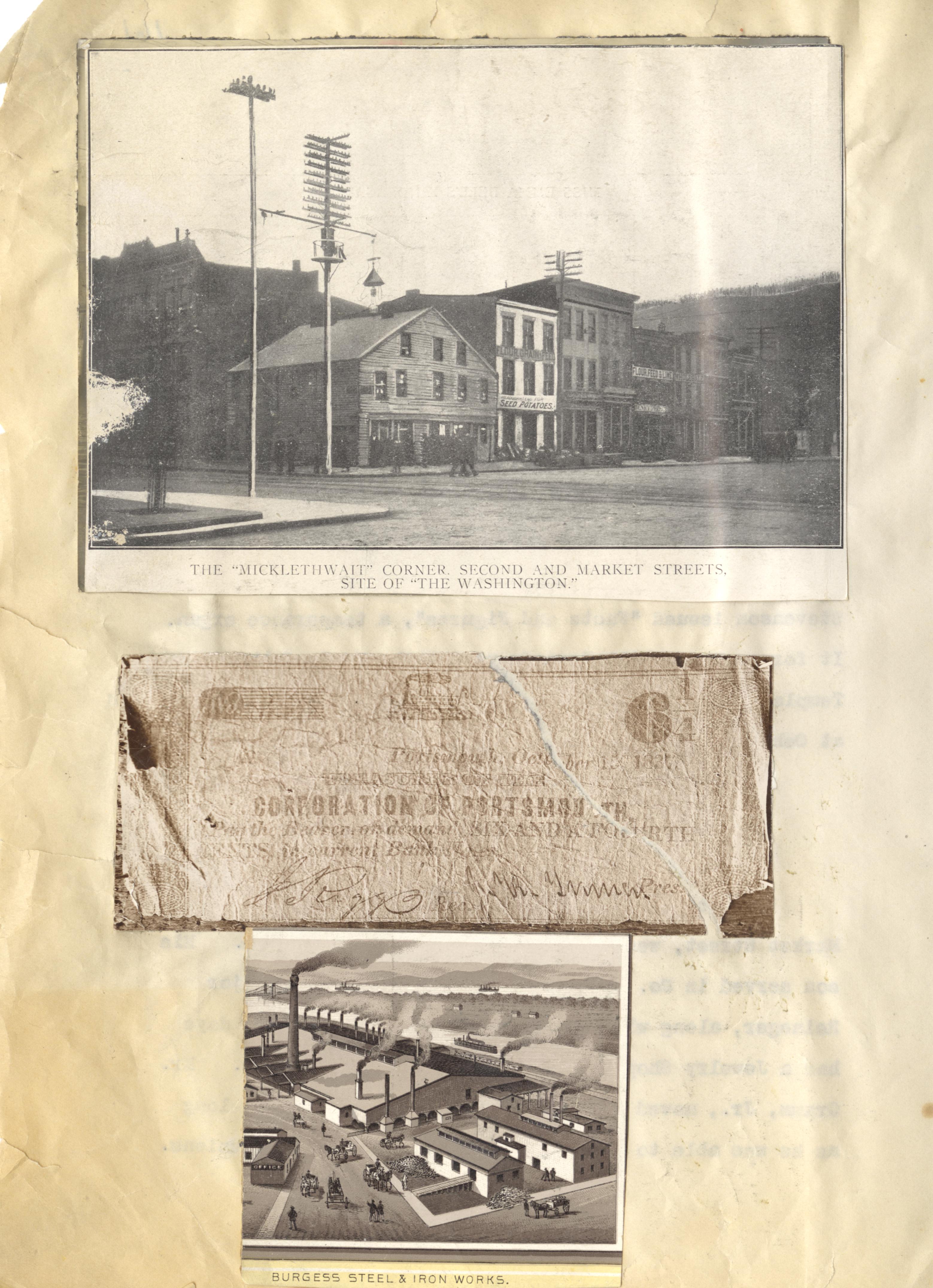 - Scanned unnumbered page from Henry A. Lorberg scrapbook containing black & white images of Micklethwait Corner; Burgess Steel & Iron Works; and Corporation of Portsmouth bank note