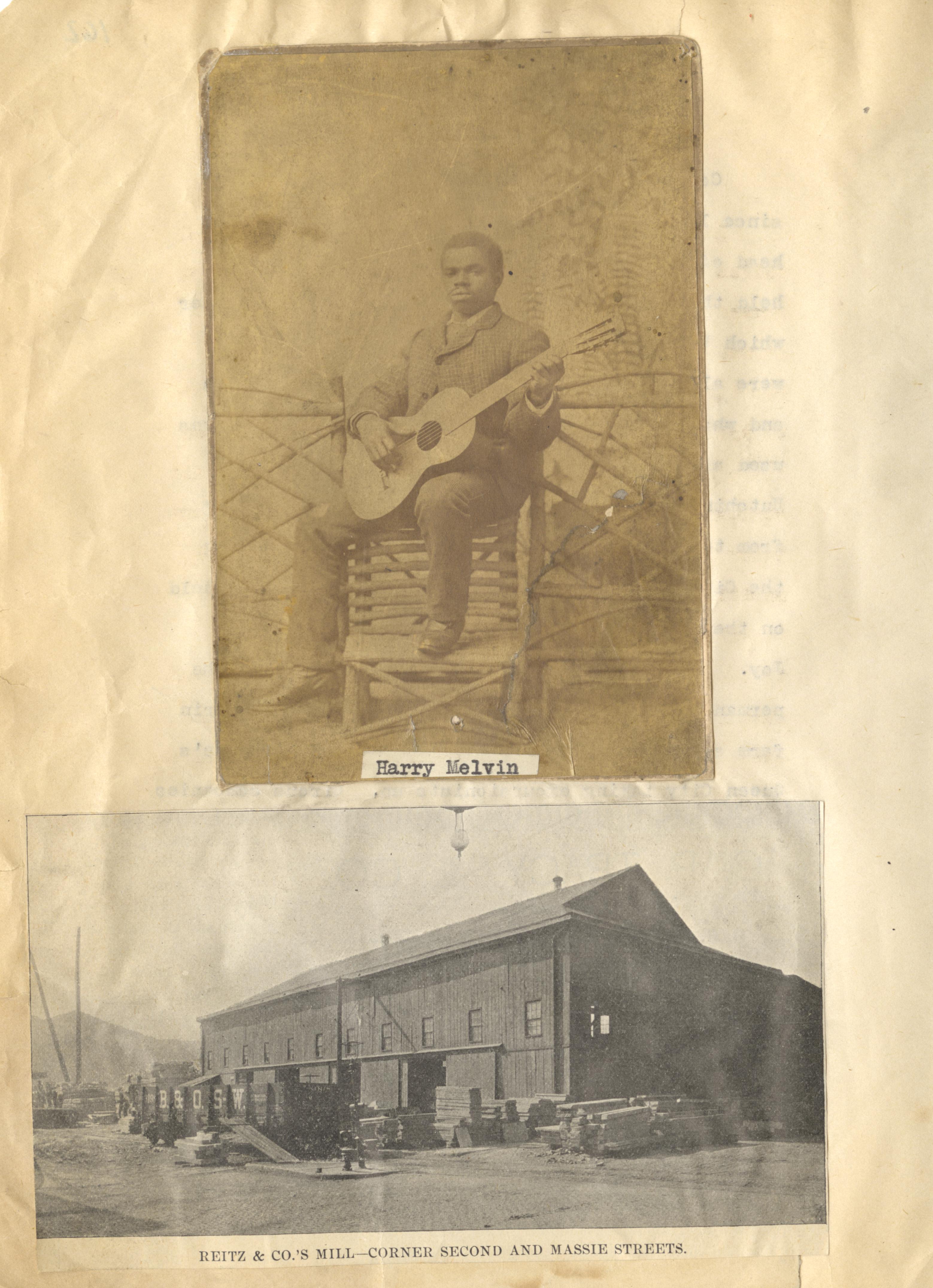 - Scanned unnumbered page from Henry A. Lorberg scrapbook containing black & white images of Harry Melvin; and Reitz & Co.'s Mill on the Corner of Second (2nd) and Massie Streets.