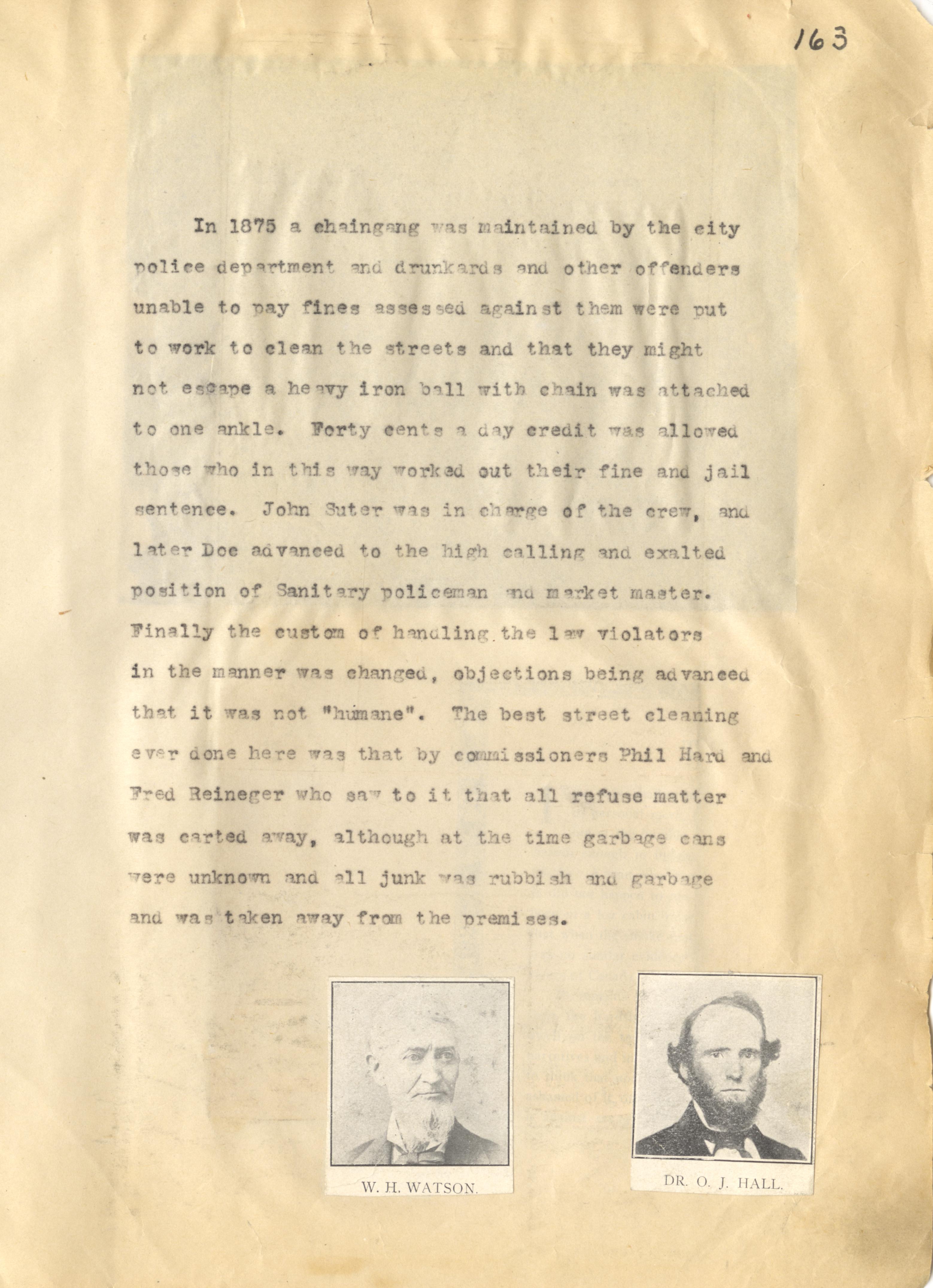 - Scanned page 163 from Henry A. Lorberg scrapbook containing a typed text narrative about chaingangs & street cleaning.