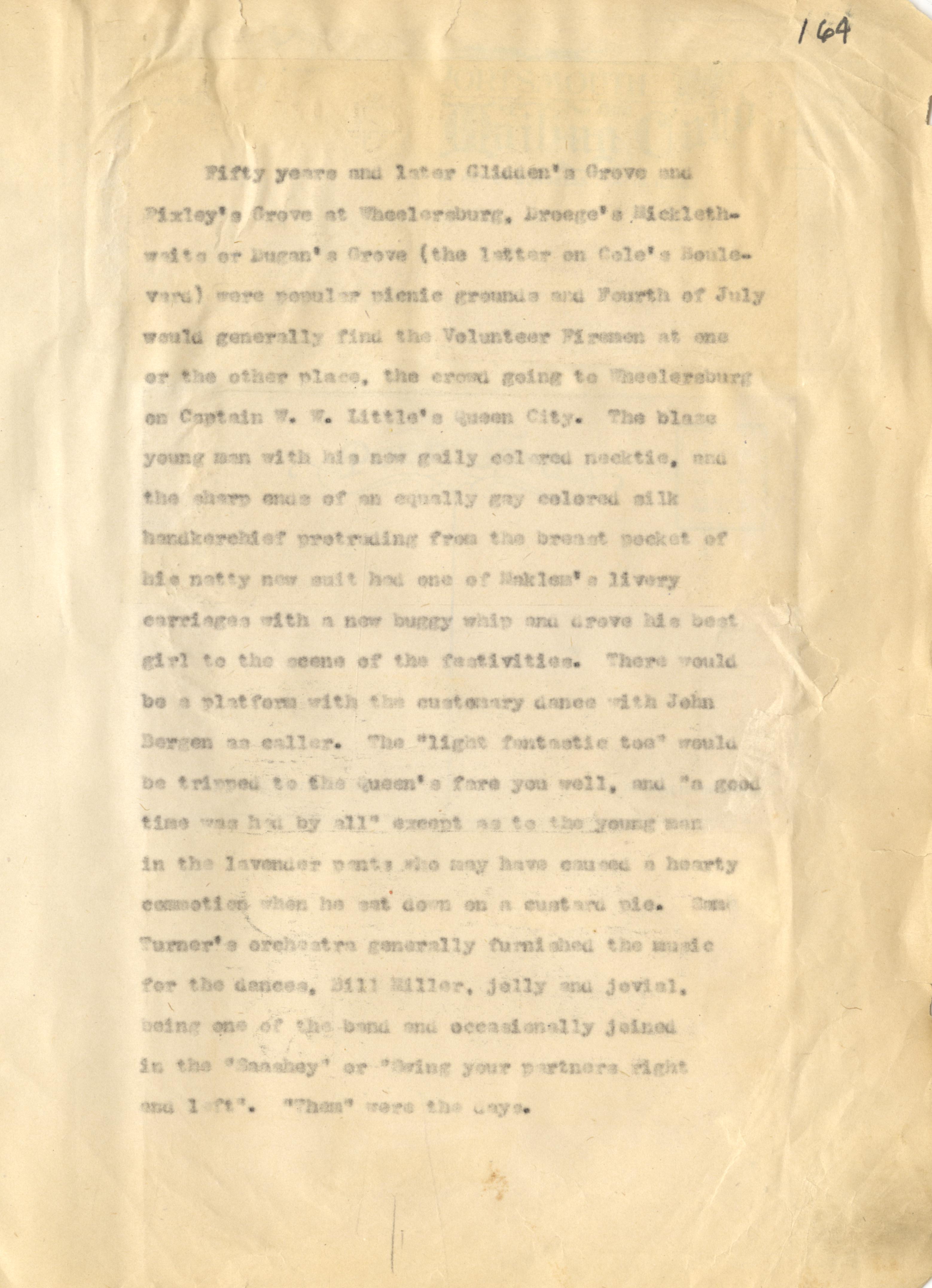 - Scanned page 164 from Henry A. Lorberg scrapbook containing a typed text narrative about popular picnic groves for Fourth of July. Glidden's Grove; Dugan's Grove; Captain w. W. Little; Bill Miller; Volunteer Firemen; Haklem's Livery Carriages