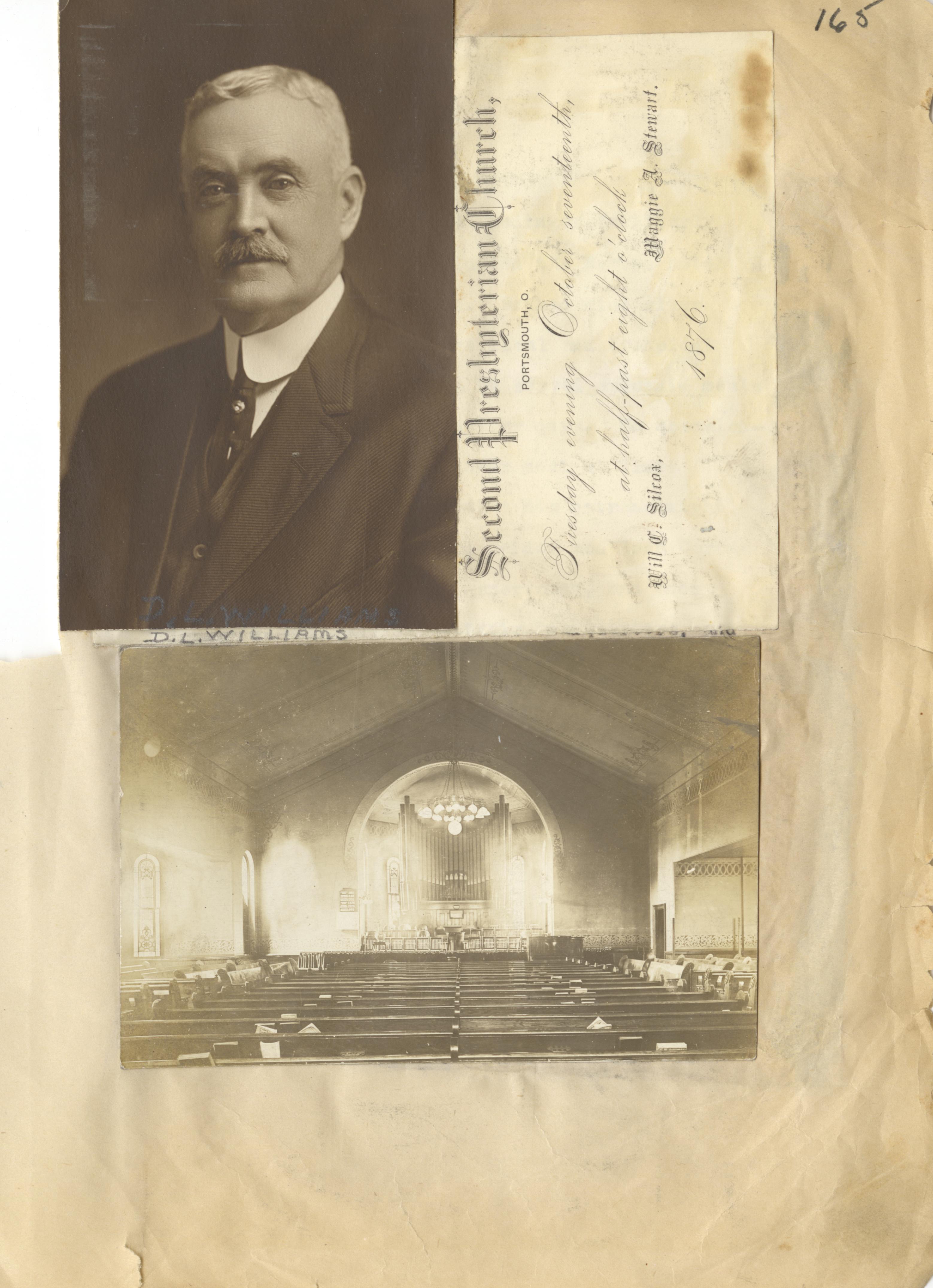 - Scanned page 165 from Henry A. Lorberg scrapbook containing black & white images of D. L. Williams and an unidentified church interior. An invitation to an event at Second Presbyterian Church in 1876.