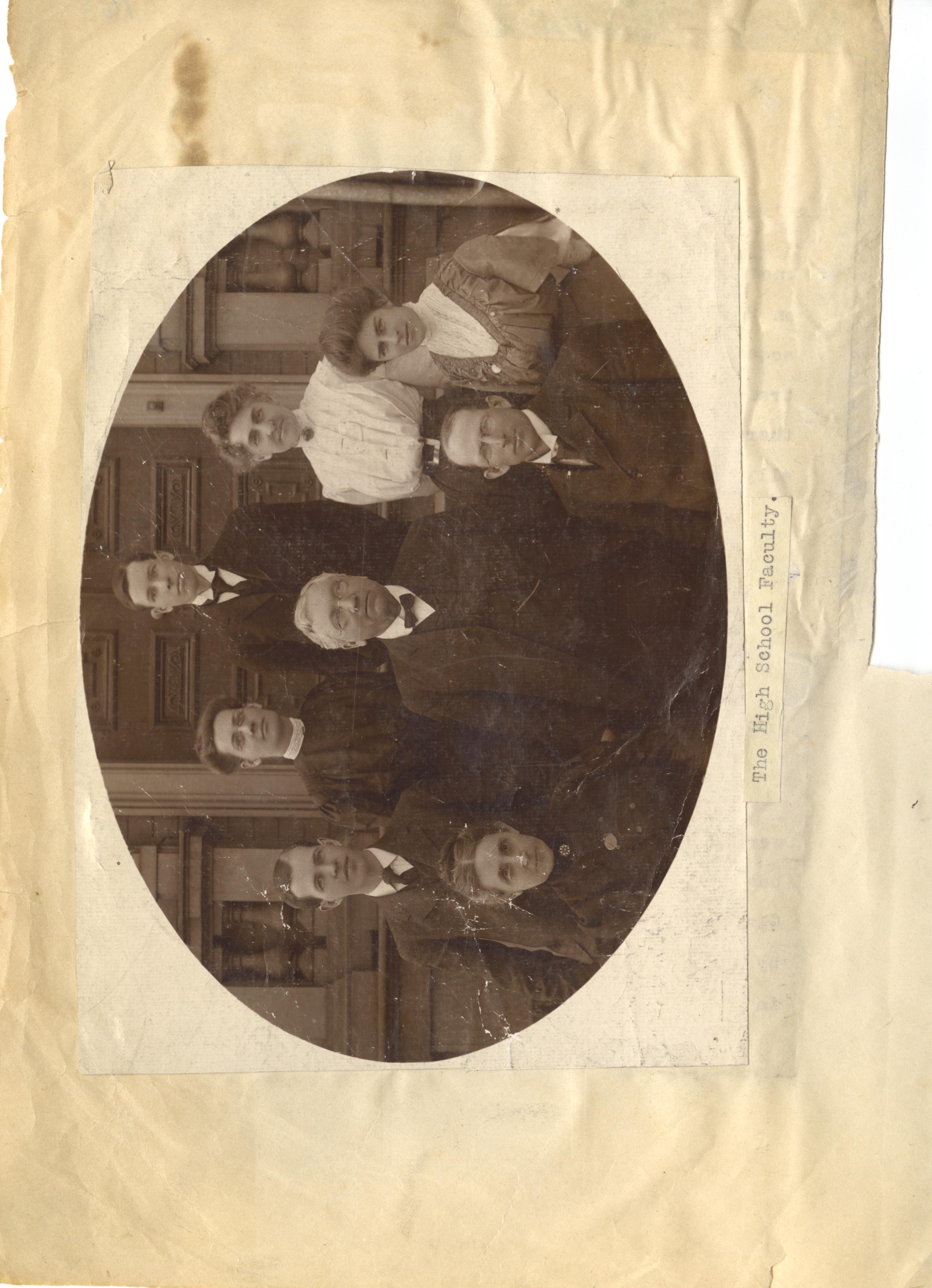 - Scanned unnumbered page from Henry A. Lorberg scrapbook containing a black & white image of The High School Faculty.