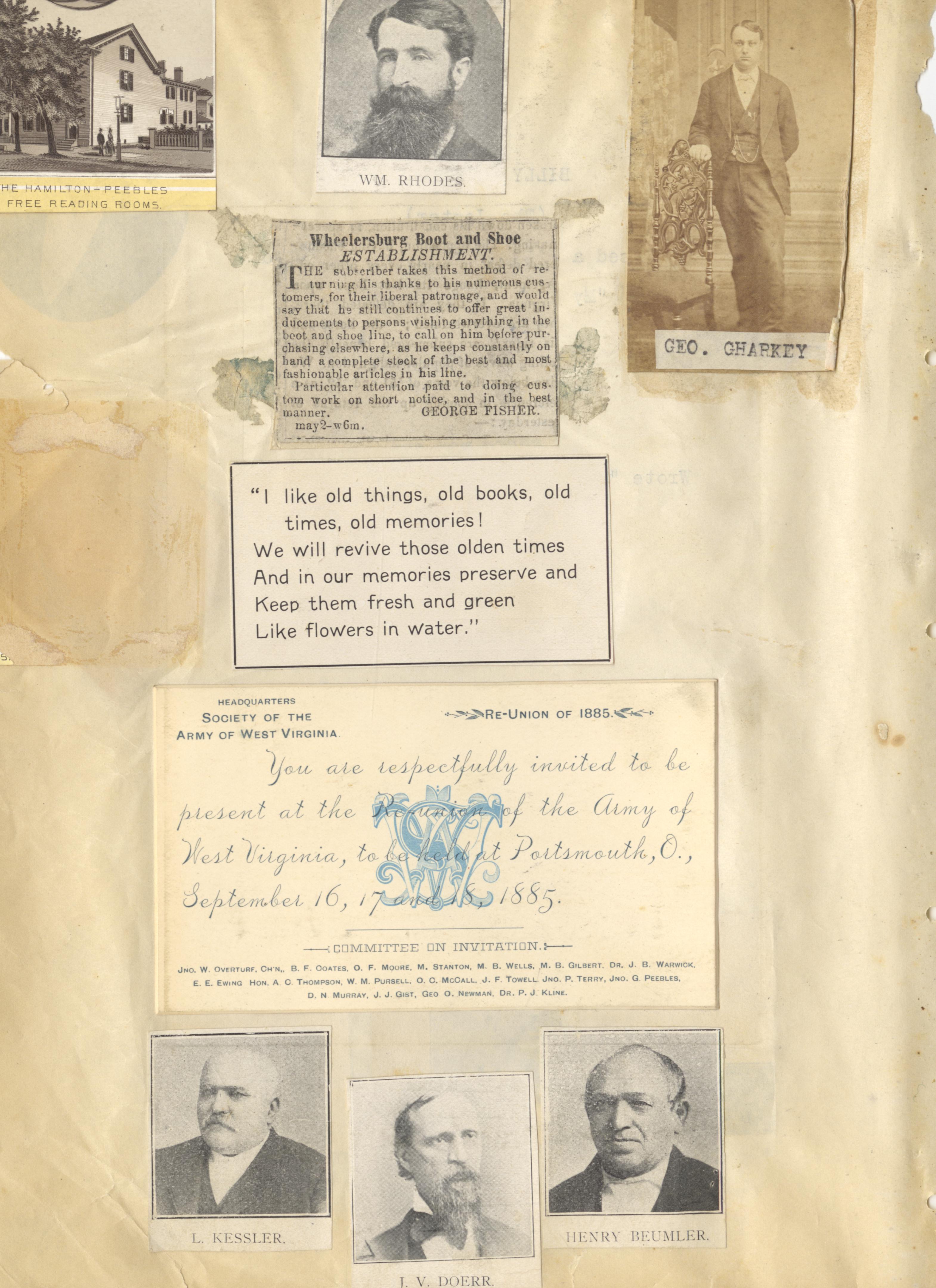 - Photo image of scanned scrapbook page. Pictured: The Hamilton-Peebles Free Reading Rooms; William Rhodes, George Gharkey; L. Kessler; J. V. Doerr; Henry Beumler; Wheelersburg Boat and Shoe Establishment; Event Invitation by the Army of West Virginia for their reunion to be held in Portsmouth in September of 1885
