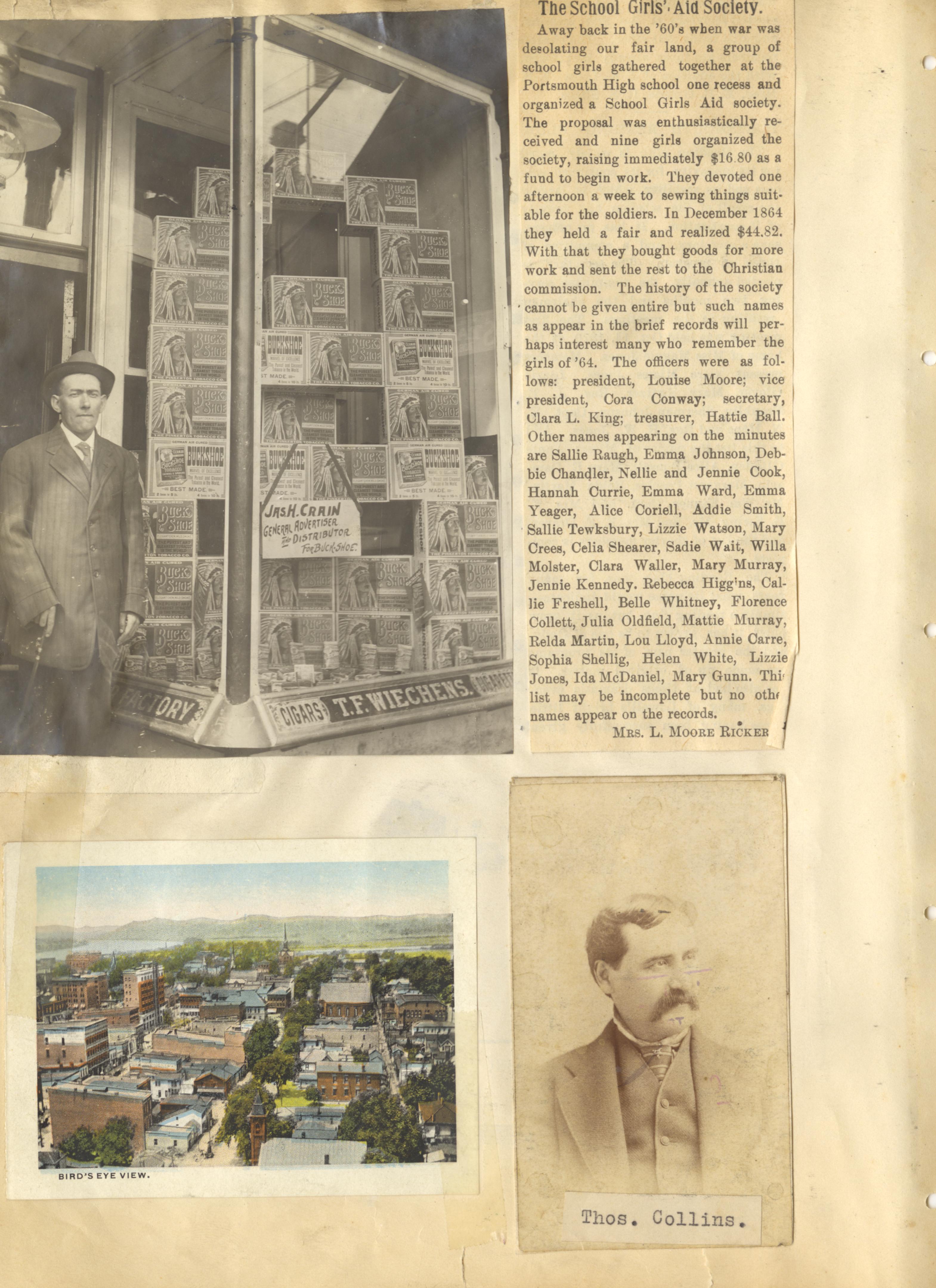 - Photo image of scanned scrapbook page. Pictured: Newspaper article about the School Girls' Aid Society; black and white photo of a window display for T. F. Wiechens Cigars and Cigarettes; Thomas Collins; Bird's Eye View of Portsmouth