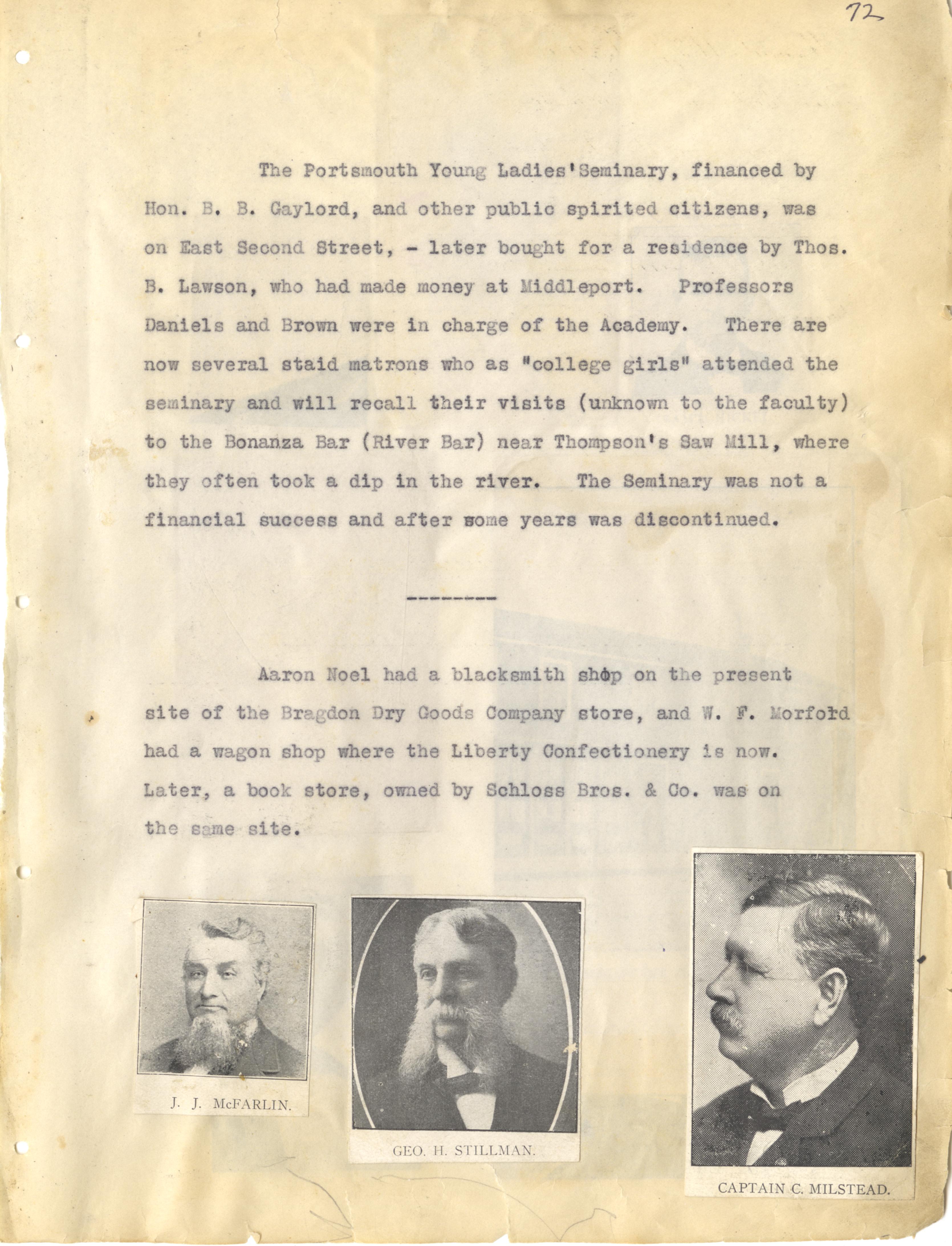 - Photo image of scanned scrapbook page. Pictured: Typed page about Portsmouth Young Ladies' Seminary, Aaron Noel's Blacksmith Shop, and W. F. Norford's Wagon Shop. Also pictured: J. J. McFarland; George H. Stillman; Captain Milstead