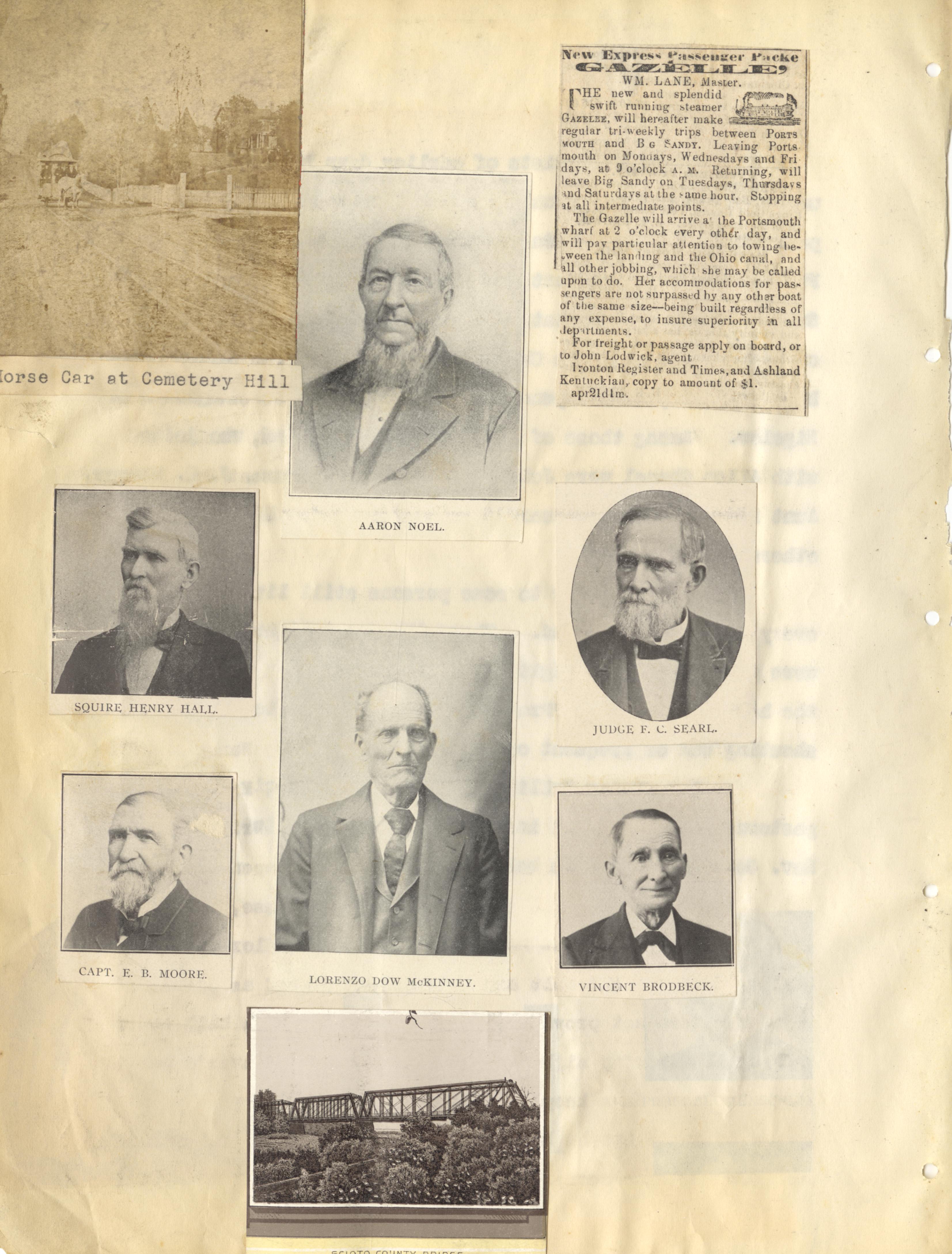 - Photo image of scanned scrapbook page. Pictured: Horse Car at Cemetery Hill; Aaron Noel; Judge F. C. Searl; Squire Henry Hall; Capt. E. B. Moore; Lorenzo Dow McKinney; Vincent Brodbeck; Scioto County Bridge