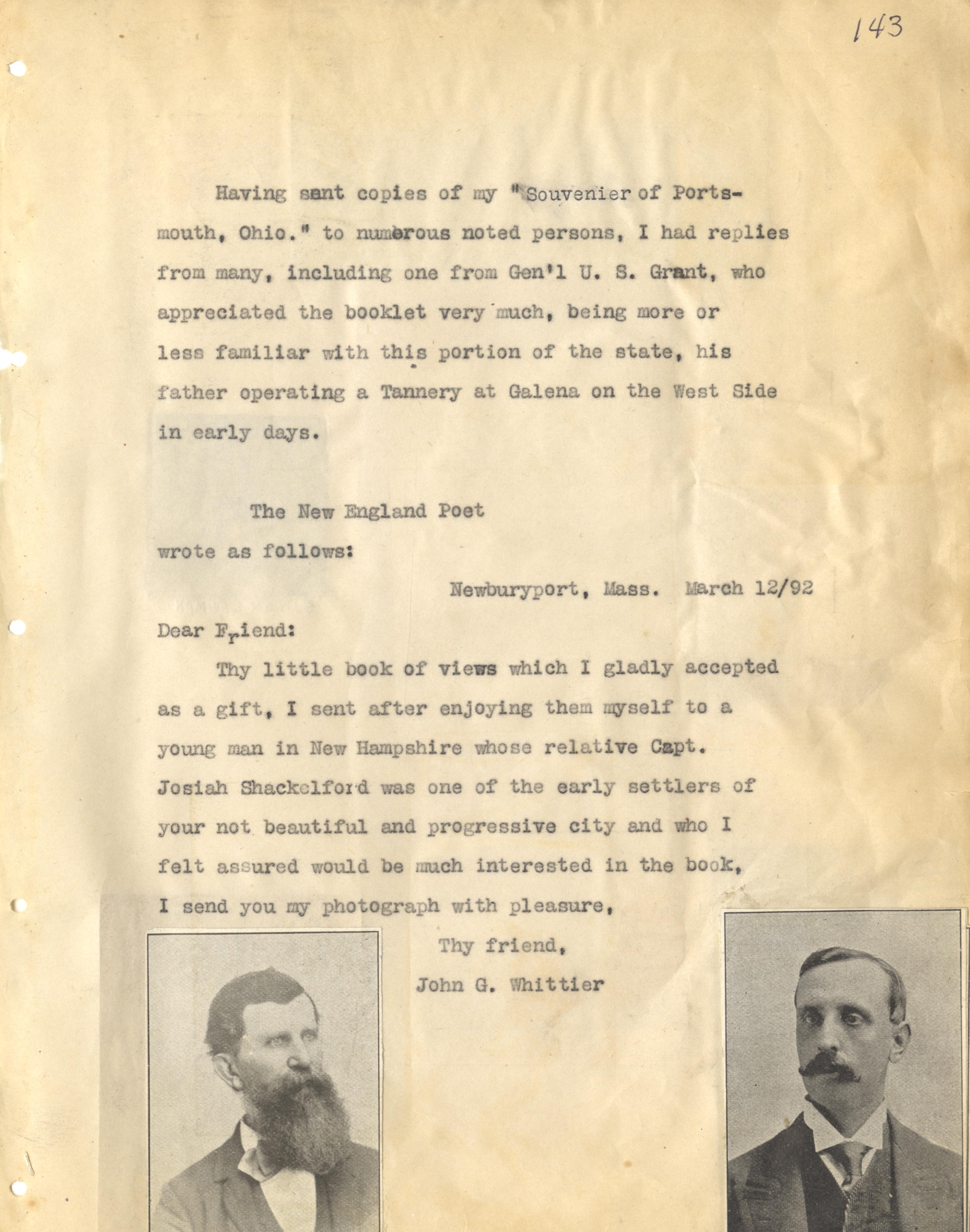 - Photo image of scanned scrapbook page. Pictured is a letter to Henry A. Lorberg about when he sent copies of the book "Souvenir of Portsmouth, Ohio" to John G. Whittier. Letter is dated March 12, 1892. Also pictured are two black and white photographs of unknown men.