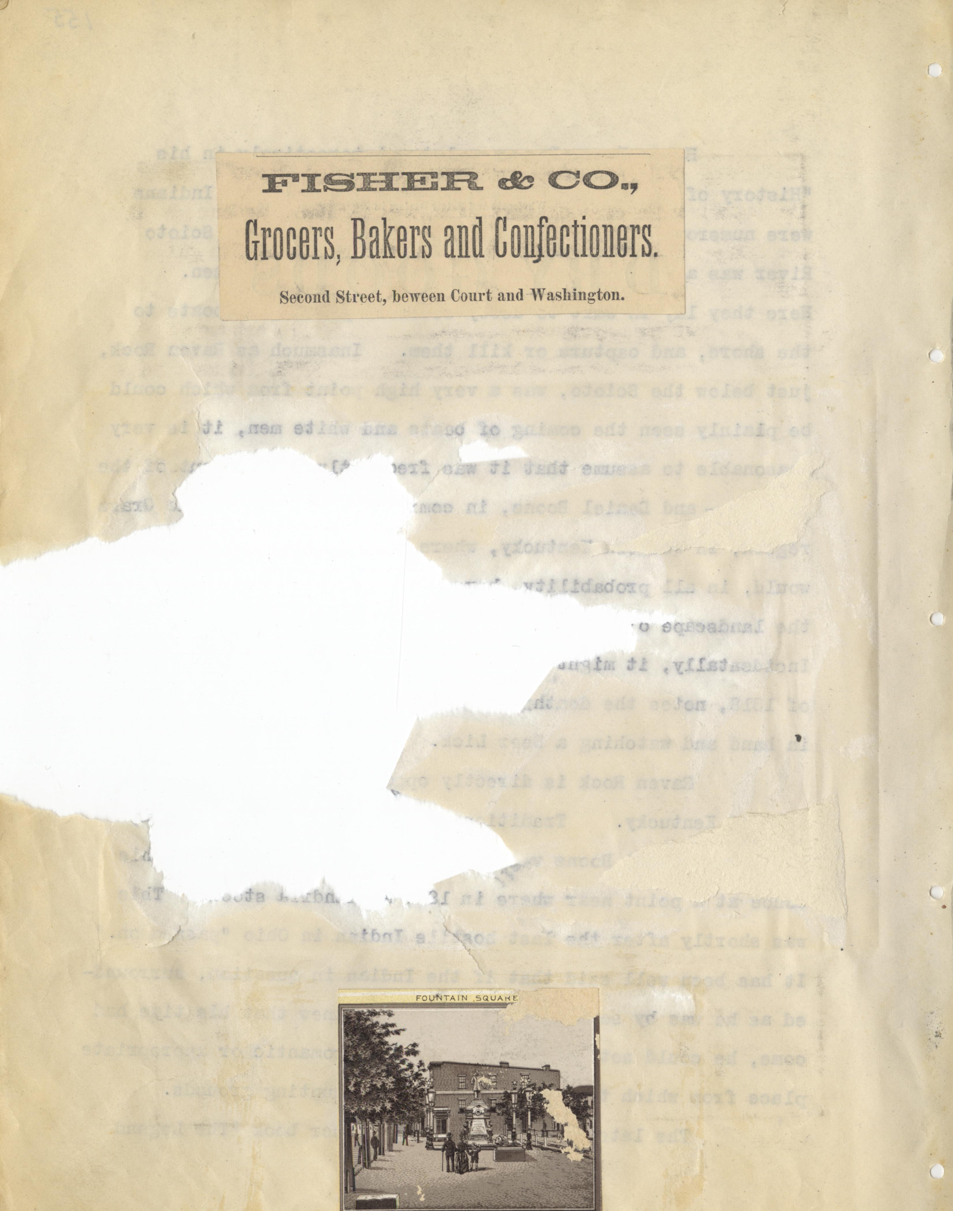- Photo image of scanned scrapbook page. Pictured is an ad for Fisher & Co. Grocers, Bakers, and Confectioners on Second (2nd) Street; Fountain Square