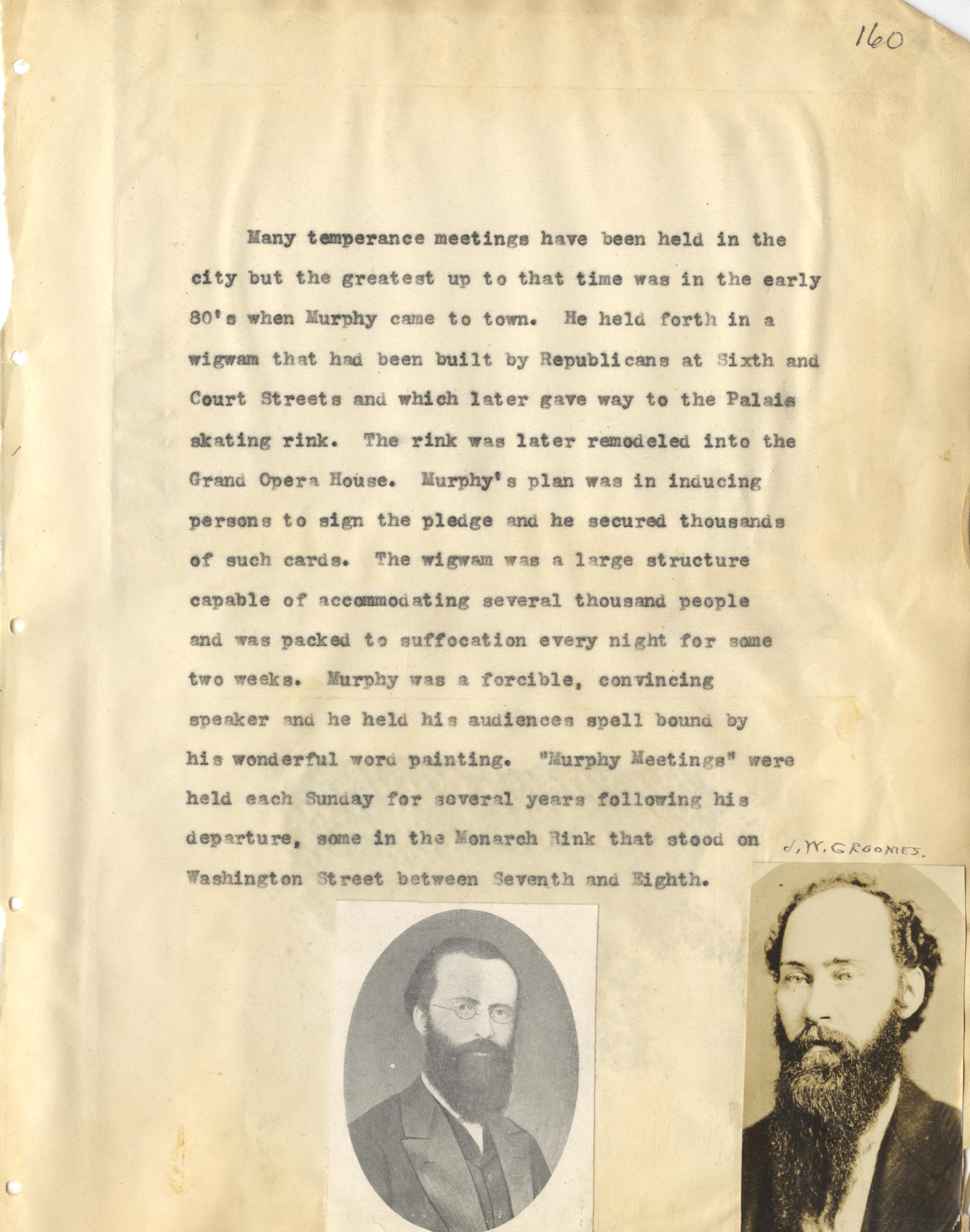 - Photo image of scanned scrapbook page. Pictured is a typed page giving some information about places in town where Temperance meetings were held. Also pictured at the bottom of the page are two black and white photographs of unknown men.